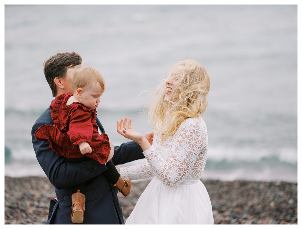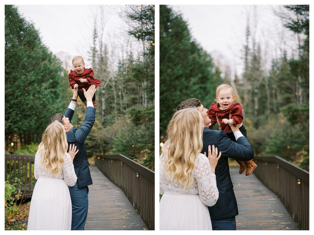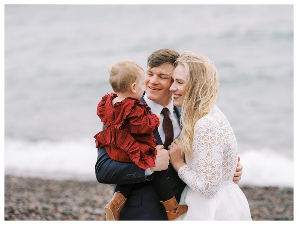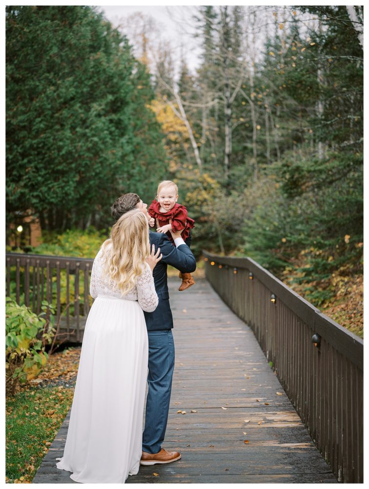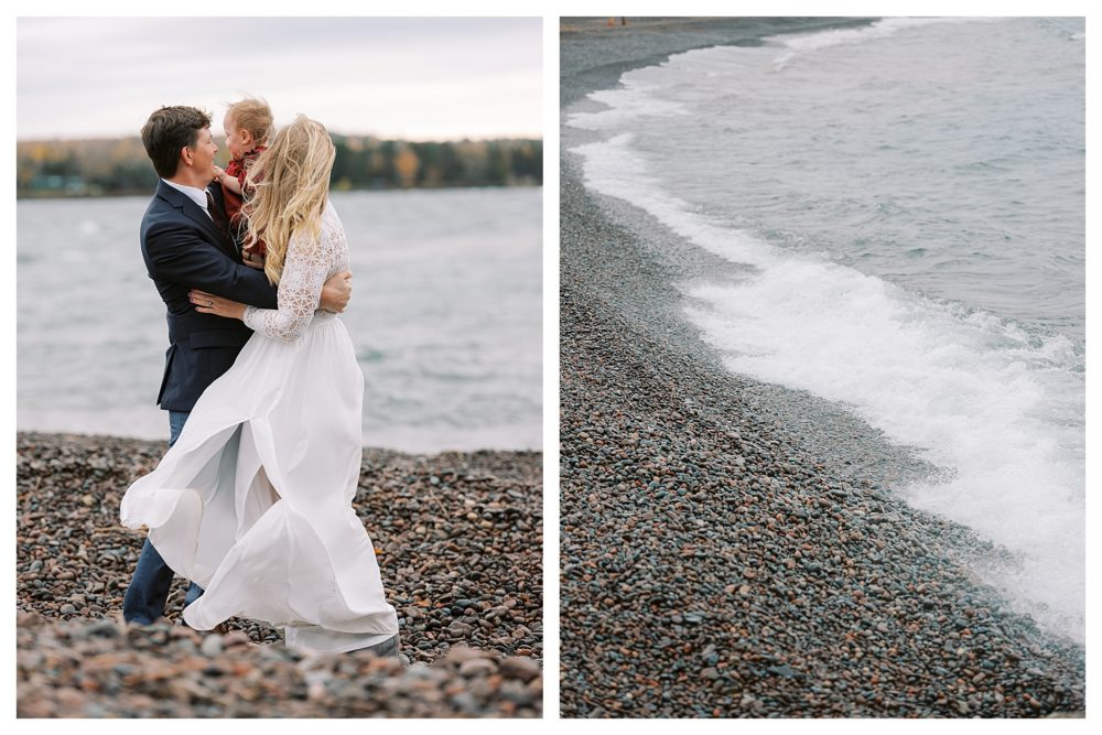 This 10 Year Vow Renewal at Superior Shores Resort in northern Minnesota is such a true reflection of life. You can envision your future. Plan away. But in order to truly enjoy it, you need to accept the unpredictable, embrace what “is”, and even better yet, smile through it all. Our plan for a beach picnic turned into a warm, cozy cabin picnic. Our plan for sunset photos on the cliffs, turned into an adventure of its own with high winds, rain and splashing waves on the rocks. Our plan to end around a campfire turned into snuggles in front of the fireplace. Even with the last minute changes (we won’t mention the dress situation lol) Carrie and Mark embraced the evening for what it is… a moment to love each other, their daughter and their life they created together.