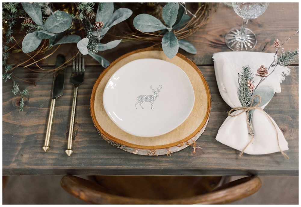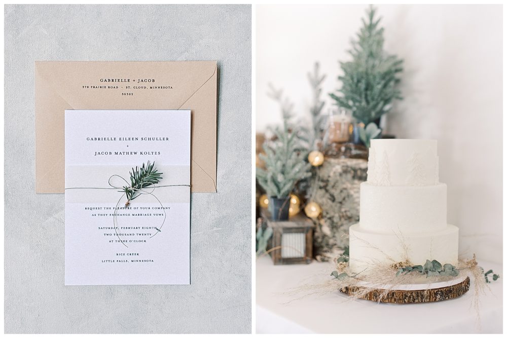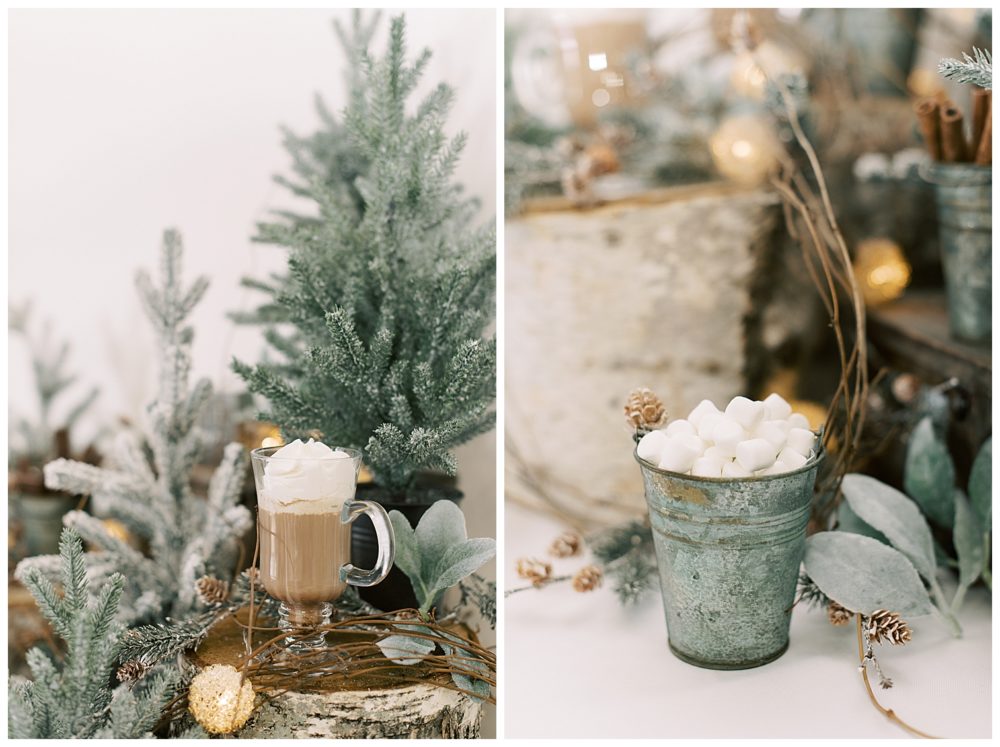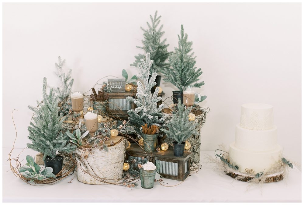 This editorial was created to inspire winter weddings here in Minnesota. Dees Decorating did a wonderful job bringing the outdoors inside. She turned Rice Creeks indoor reception area into a simply beautiful woodsy winter wonderland. It featured some frosted pine trees, wooded plate holders, snowflake wine glasses and a pine tree etched cake created by Dough-phoria based in Alexandria. To take the winter chill out of you and nurture your sweet tooth, she created a cute woodsy hot chocolate and s’more table.