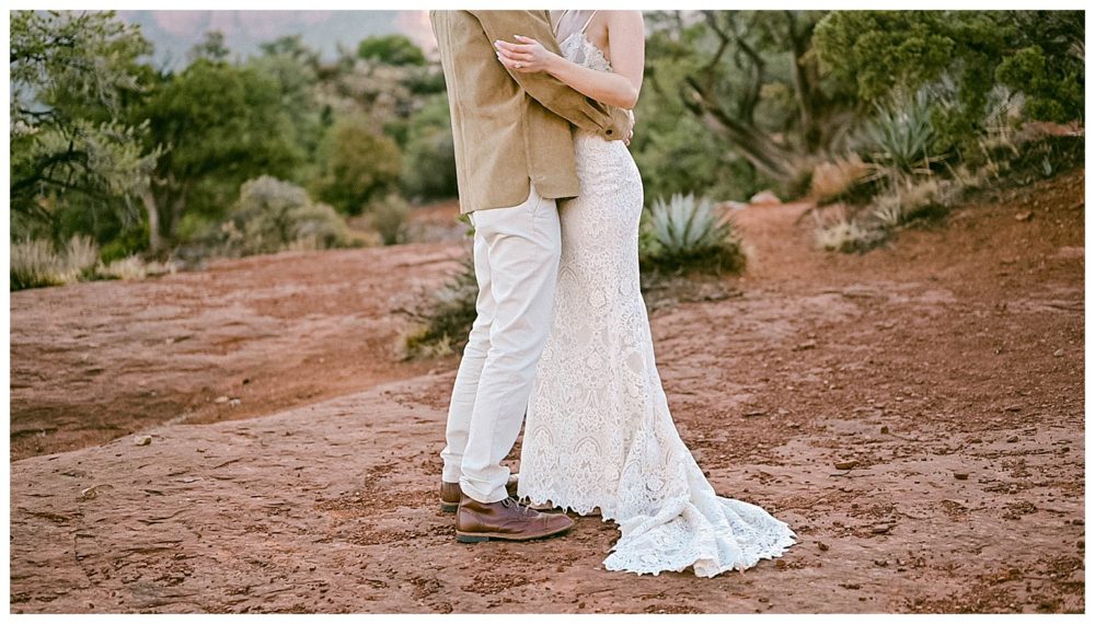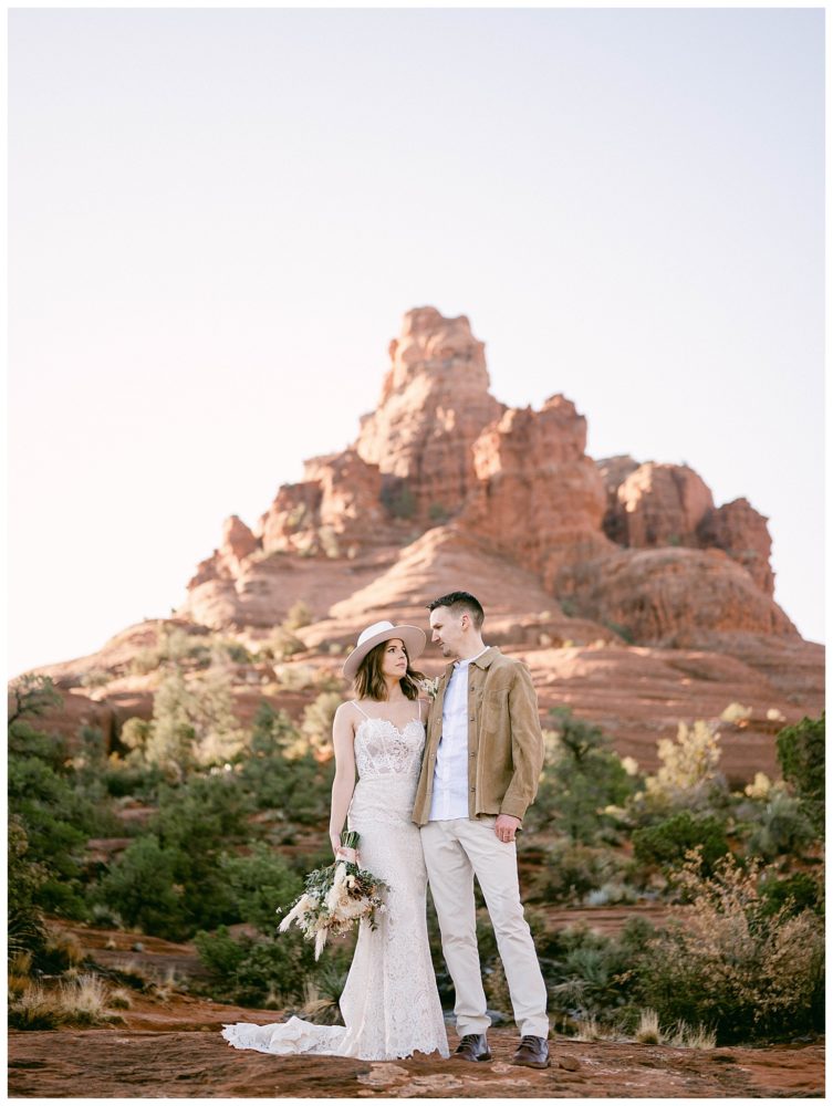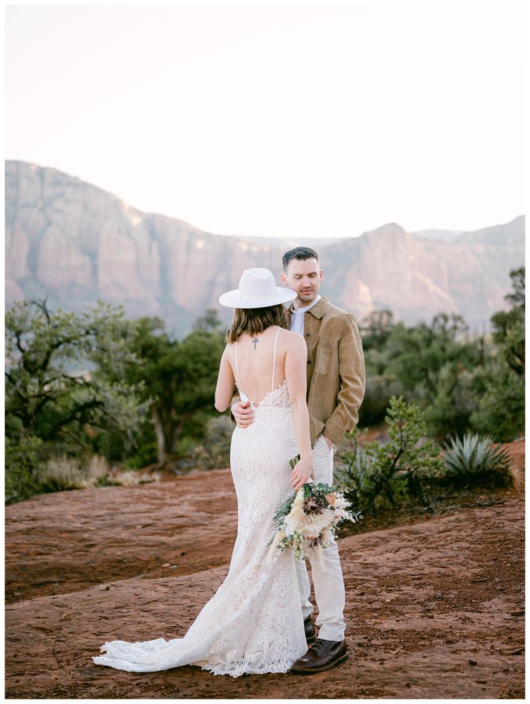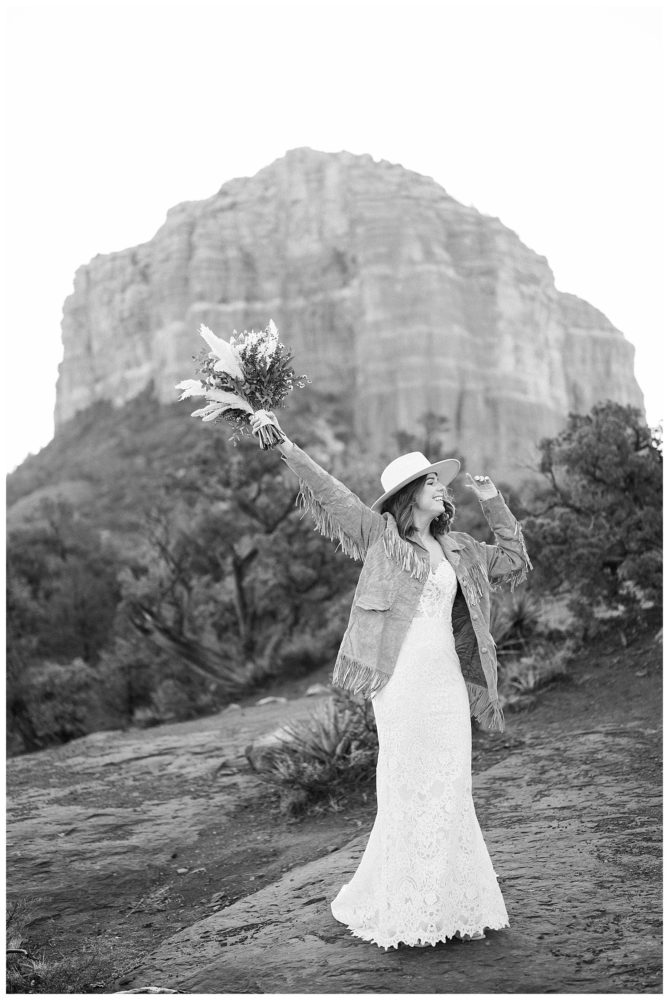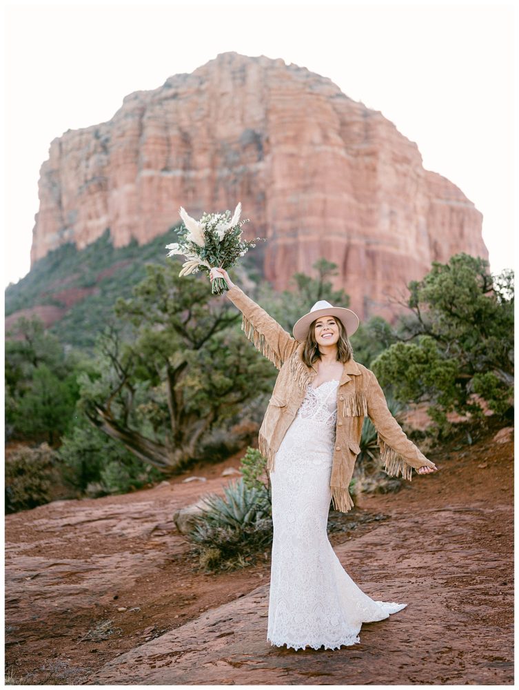If any couple was meant to be married in Sedona, it is Sydney and Devon! Their authentic personalities and spiritual, but spunky nature fit right in with the soul replenishing views Sedona surrounds you with. They chose to elope at sunrise to avoid tourists since Bell Rock and Courthouse Vista are popular tourist attractions (rightfully so;). While Sedona is known for its beautiful weather, it must have known I came from Minnesota and wanted me to feel at home!! Sorry Sydney and Devon. My daughter swears cold weather follows me to make sure I always come home! Regardless, this savvy couple found adorable jackets at Blackbird Vintage located right here in Sedona. They were the perfect compliment to their bojo style and “helped” keep them a bit warmer on the brisk 32 degree morning.