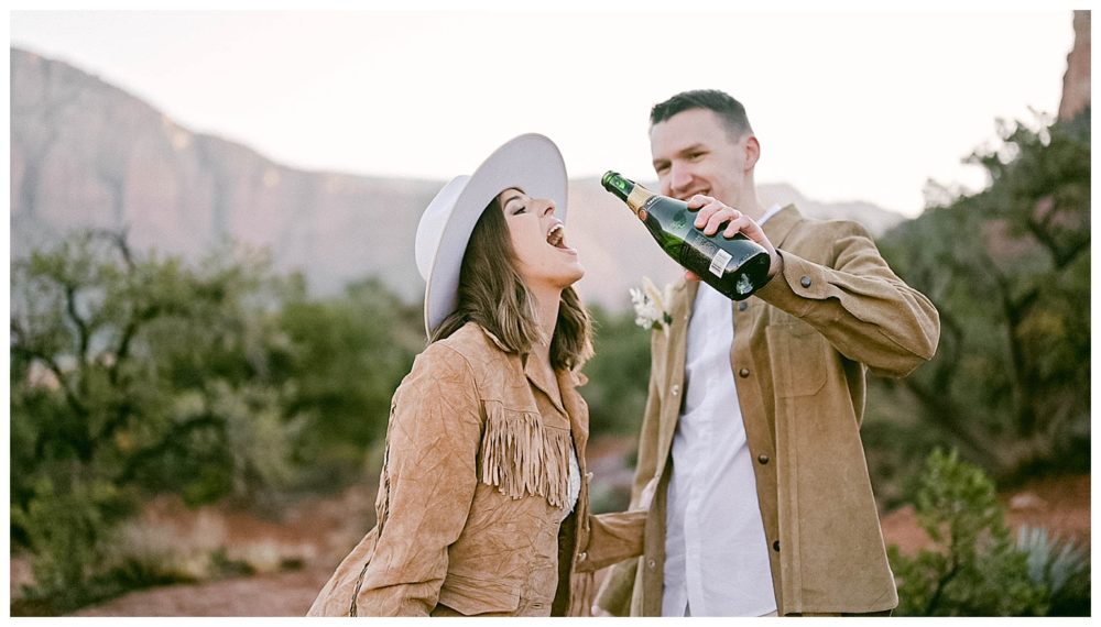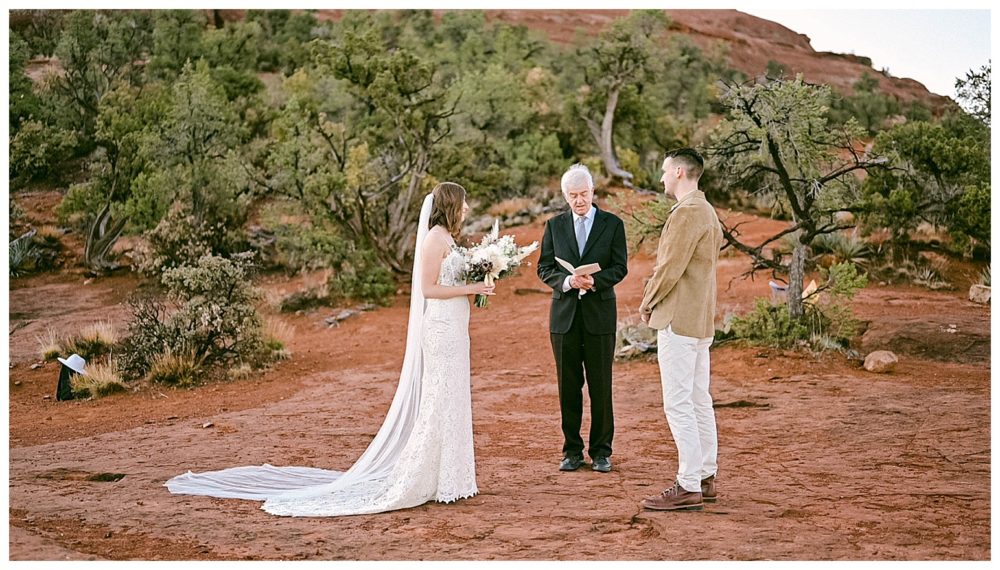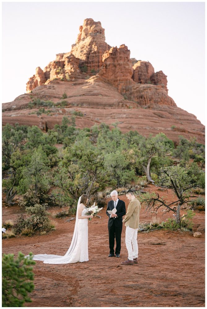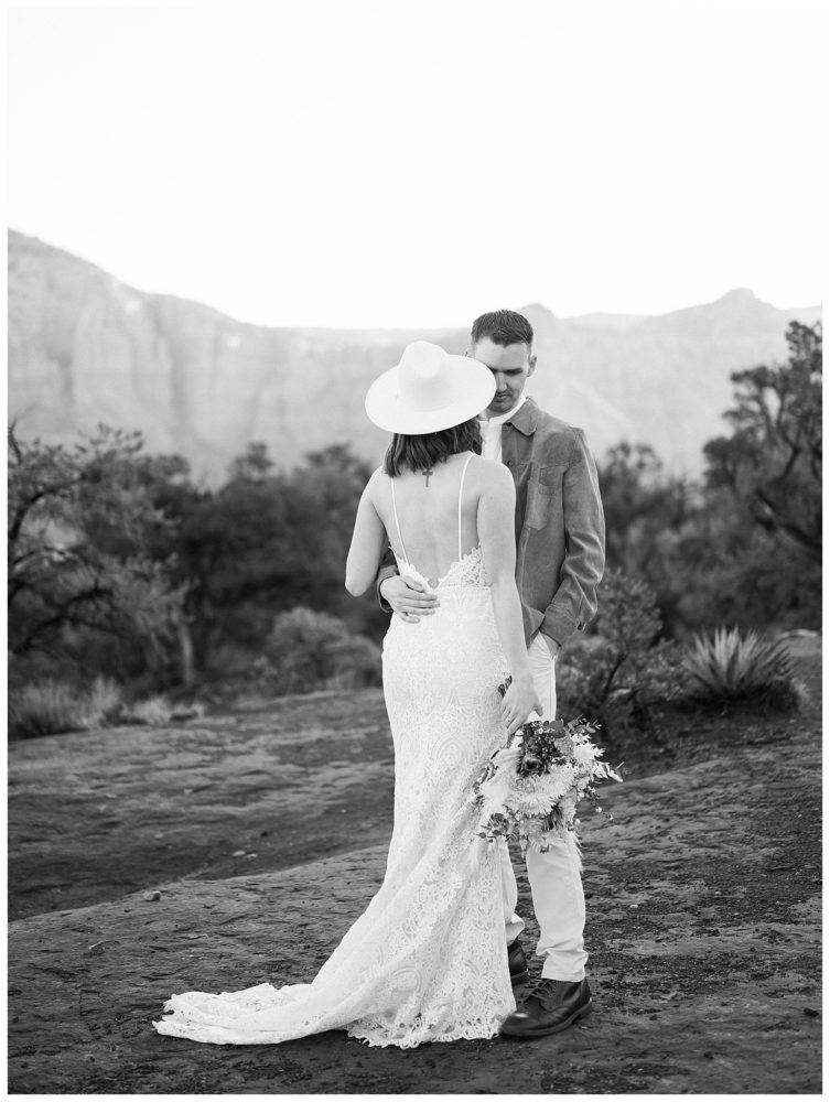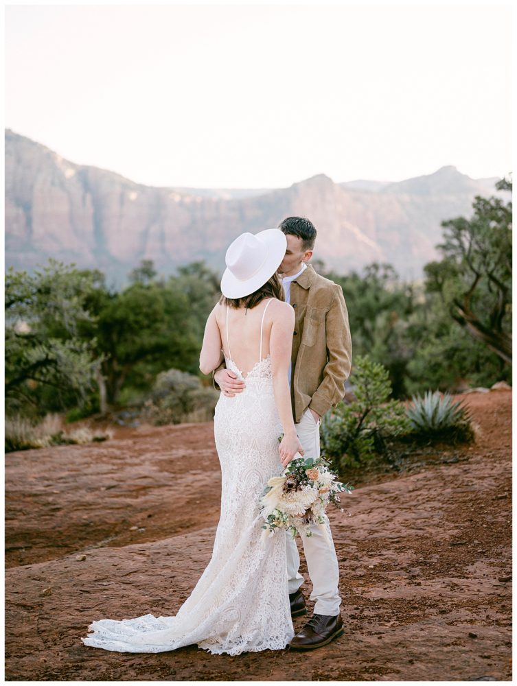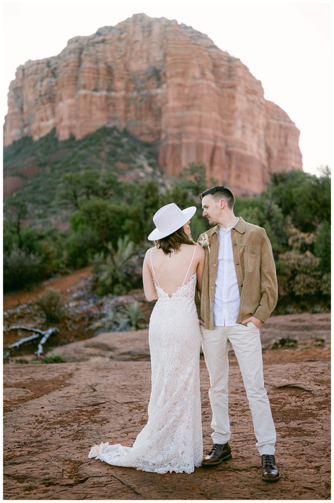 If any couple was meant to be married in Sedona, it is Sydney and Devon! Their authentic personalities and spiritual, but spunky nature fit right in with the soul replenishing views Sedona surrounds you with. They chose to elope at sunrise to avoid tourists since Bell Rock and Courthouse Vista are popular tourist attractions (rightfully so;). While Sedona is known for its beautiful weather, it must have known I came from Minnesota and wanted me to feel at home!! Sorry Sydney and Devon. My daughter swears cold weather follows me to make sure I always come home! Regardless, this savvy couple found adorable jackets at Blackbird Vintage located right here in Sedona. They were the perfect compliment to their bojo style and “helped” keep them a bit warmer on the brisk 32 degree morning.