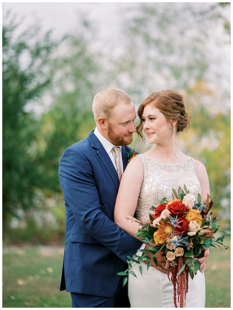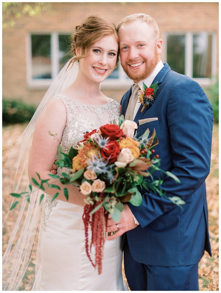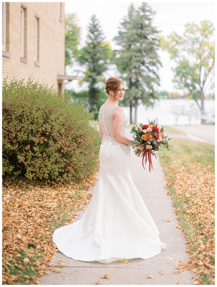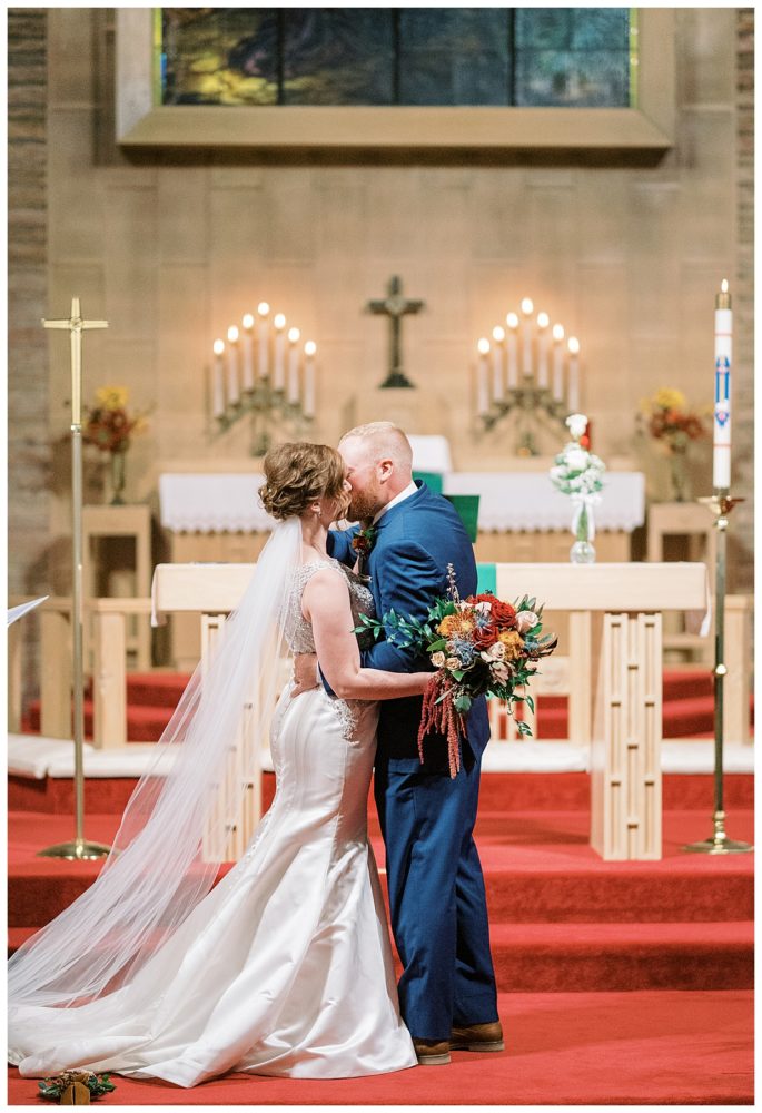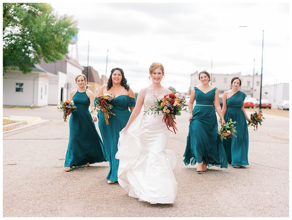 “Josh proposed to me about a month after we had a “pretend” wedding photoshoot with Trisha and now I feel we have come full circle! He finally proposed on October 19th, 2019. We knew we had wanted a Fall wedding and immediately chose the date of October 3rd, 2020. Besides finding my dress, we really hadn’t planned much by the time Covid-19 hit, which was almost a blessing in disguise. We originally had 350 people on our invite list and we were days away from sending “Save the Dates” along with putting deposits down on our venue/caterer. We knew that we had to make a choice that would be practical for both us and the safety of our guests. We chose to downsize our wedding to only include our wedding party and immediate family (42 people total including Josh and I). October 3rd came around and we were so thankful to be able to get married at Christ Lutheran Church in Cottonwood, MN. Following our ceremony, we had our intimate dinner reception at Bello Cucina in Marshall, MN. Our day was not how we had imagined, but everything we could’ve dreamed for. Honestly, we would have gotten married in a courthouse parking lot if it meant getting to become husband and wife, but I’m glad that didn’t need to happen. We sit back today and reflect on how blessed we were. A few vendors that made our day perfect were Xsperience Photography, Hy-Vee Floral in Marshall, MN, Finley Florence Bridal in Spicer, MN and Main Stay Cafe in Marshall, MN for our amazing cake and cupcakes.”