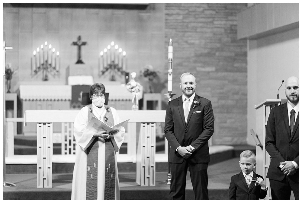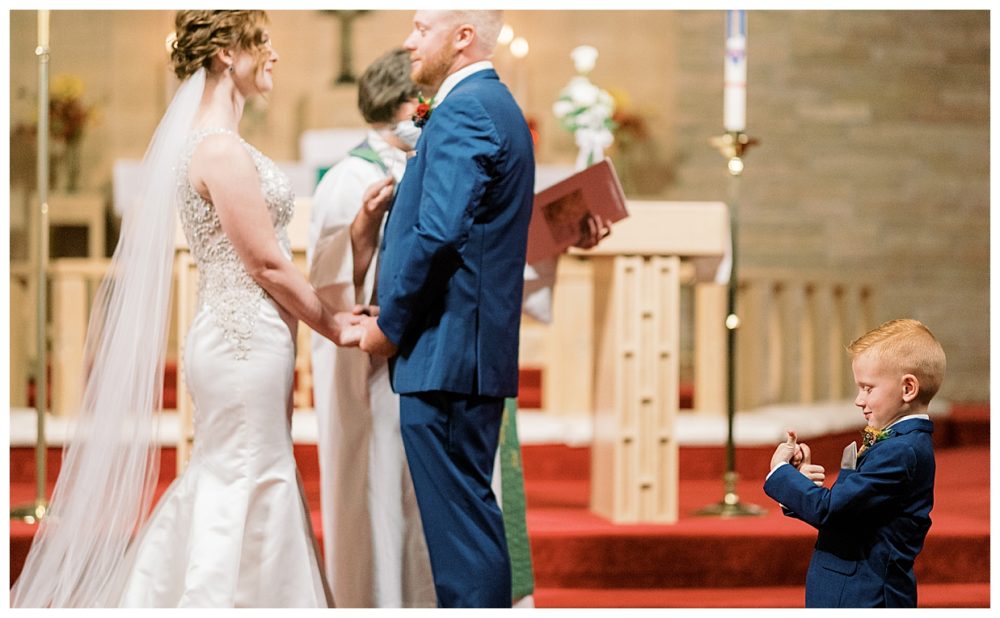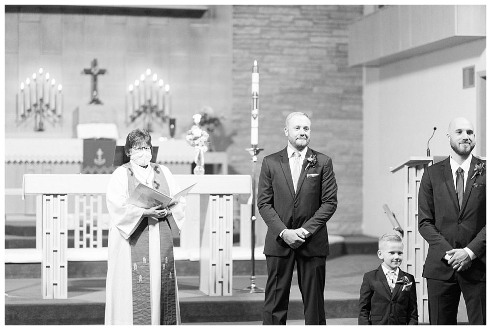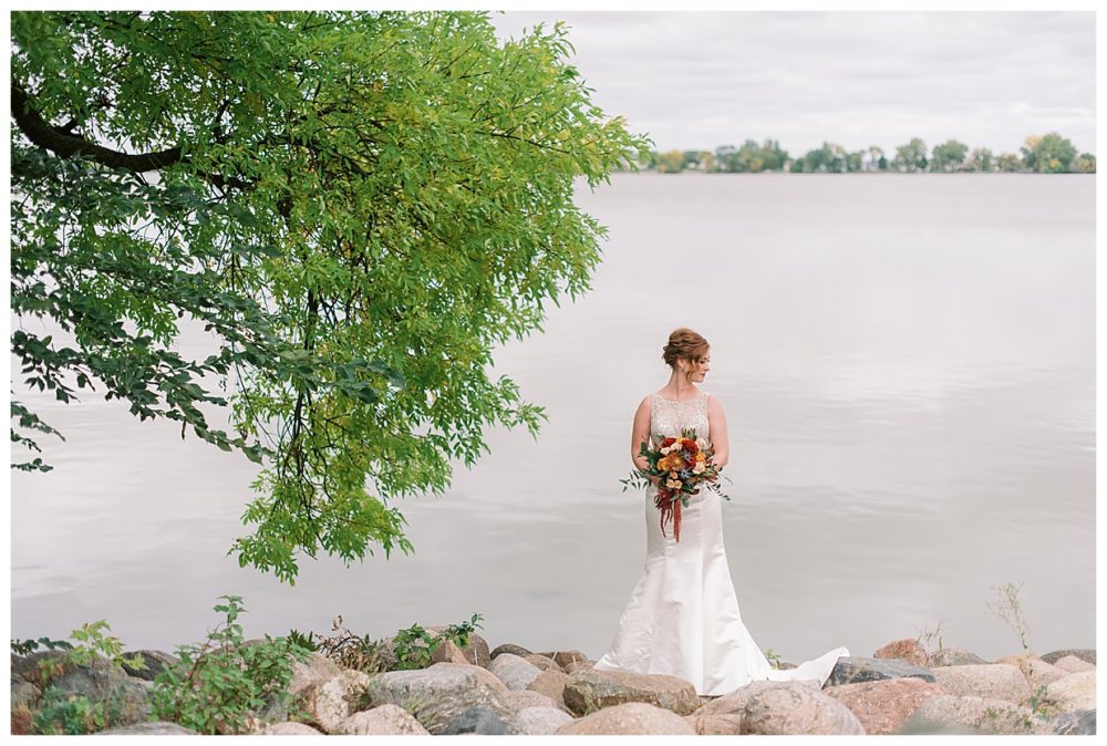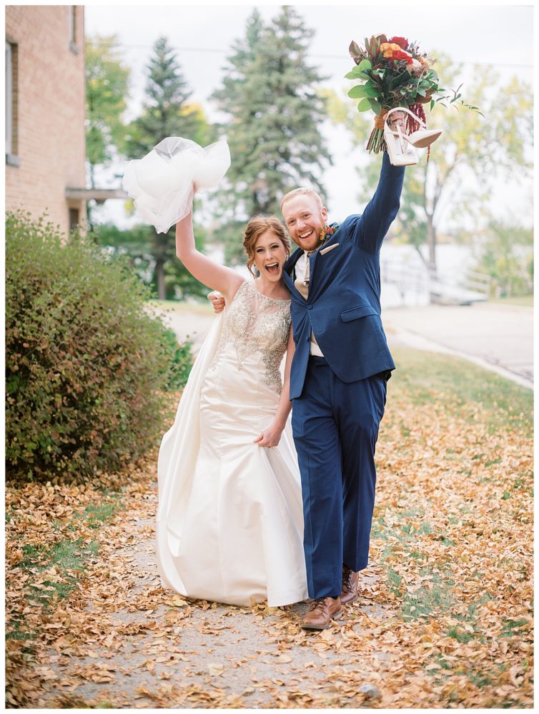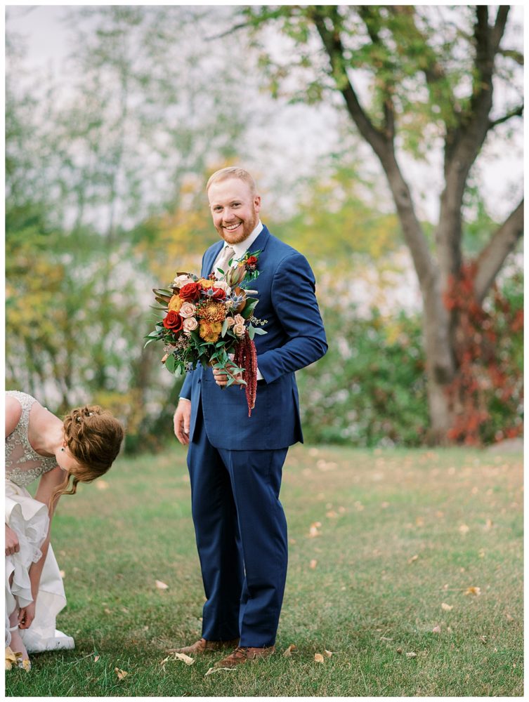 “Josh proposed to me about a month after we had a “pretend” wedding photoshoot with Trisha and now I feel we have come full circle! He finally proposed on October 19th, 2019. We knew we had wanted a Fall wedding and immediately chose the date of October 3rd, 2020. Besides finding my dress, we really hadn’t planned much by the time Covid-19 hit, which was almost a blessing in disguise. We originally had 350 people on our invite list and we were days away from sending “Save the Dates” along with putting deposits down on our venue/caterer. We knew that we had to make a choice that would be practical for both us and the safety of our guests. We chose to downsize our wedding to only include our wedding party and immediate family (42 people total including Josh and I). October 3rd came around and we were so thankful to be able to get married at Christ Lutheran Church in Cottonwood, MN. Following our ceremony, we had our intimate dinner reception at Bello Cucina in Marshall, MN. Our day was not how we had imagined, but everything we could’ve dreamed for. Honestly, we would have gotten married in a courthouse parking lot if it meant getting to become husband and wife, but I’m glad that didn’t need to happen. We sit back today and reflect on how blessed we were. A few vendors that made our day perfect were Xsperience Photography, Hy-Vee Floral in Marshall, MN, Finley Florence Bridal in Spicer, MN and Main Stay Cafe in Marshall, MN for our amazing cake and cupcakes.”