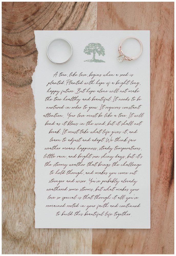“A tree, like love, begins when a seed is planted. Planted with hope of a bright, long, happy future. But hope alone will not make the tree healthy and beautiful. It needs to be nurtured in order to grow. It requires constant attention. Your love must be like a tree. It will bend as it blows in the wind, but it shall not break. It must take what life gives it, and learn to adjust and adapt. We think fair weather means happiness; steady temperatures, little rain, and bright sun shiny days. But it’s the stormy weather that brings the challenge to hold through, and makes you come out stronger and wiser. You’ve probably weathered some storms, but what makes your love so special is that through it all you’ve remained rooted in your faith and continued to build this beautiful life together.”