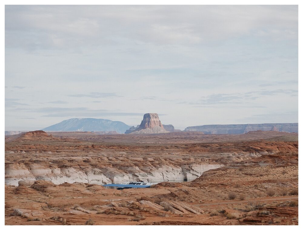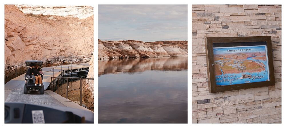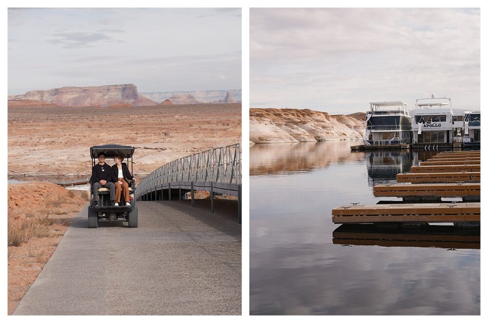 Halle and Abram were dreaming of slot canyon photos in the Lake Powell area of Page, in northern Arizona. Unfortunately we found out the only way to view the slot canyons was by paying Antelope Canyon Tours $80/person. Which may have been worth it, but no photography sessions are allowed on the tours so we ruled the slot canyons out and “settled” for something equally as great…Antelope Point Marina. Not only did we get the Marina to ourselves to explore and laugh and play, we got to end the session with a unique experience. Since the water level was low in the marina we were escorted on a golf cart down to the world’s largest floating restaurant, Jádí’Tooh Restaurant.