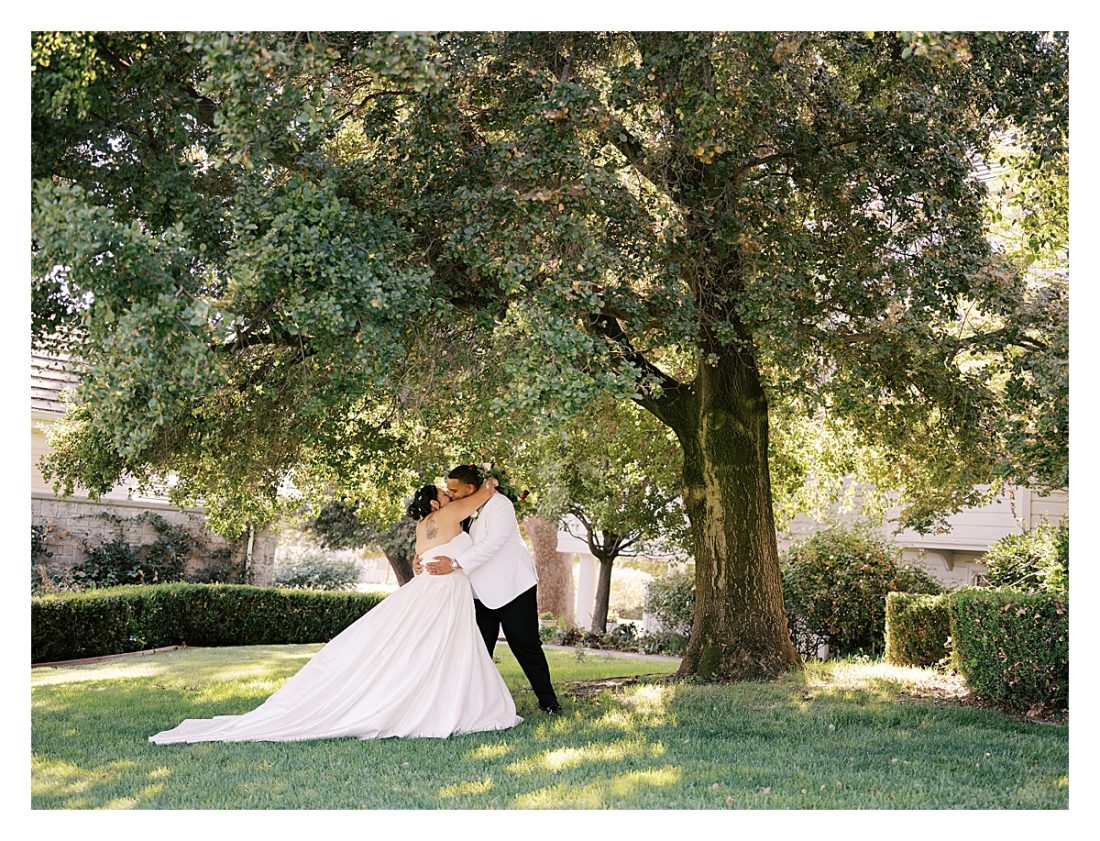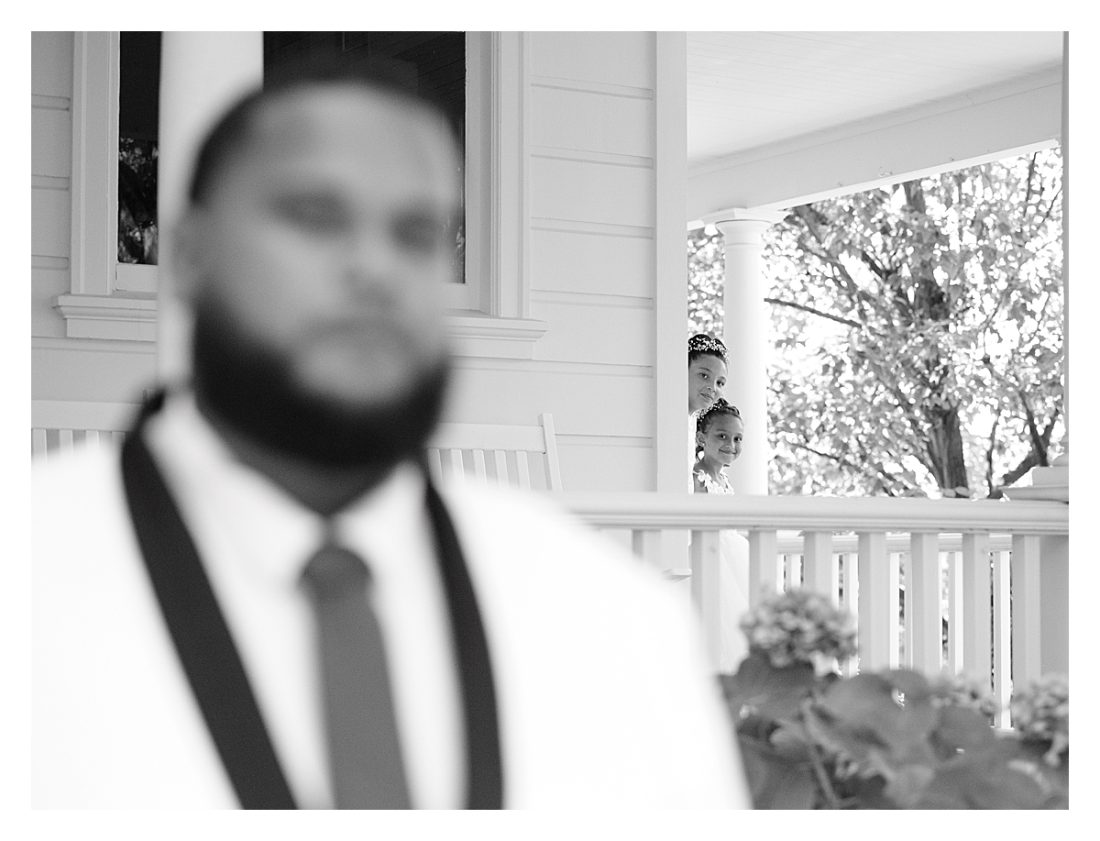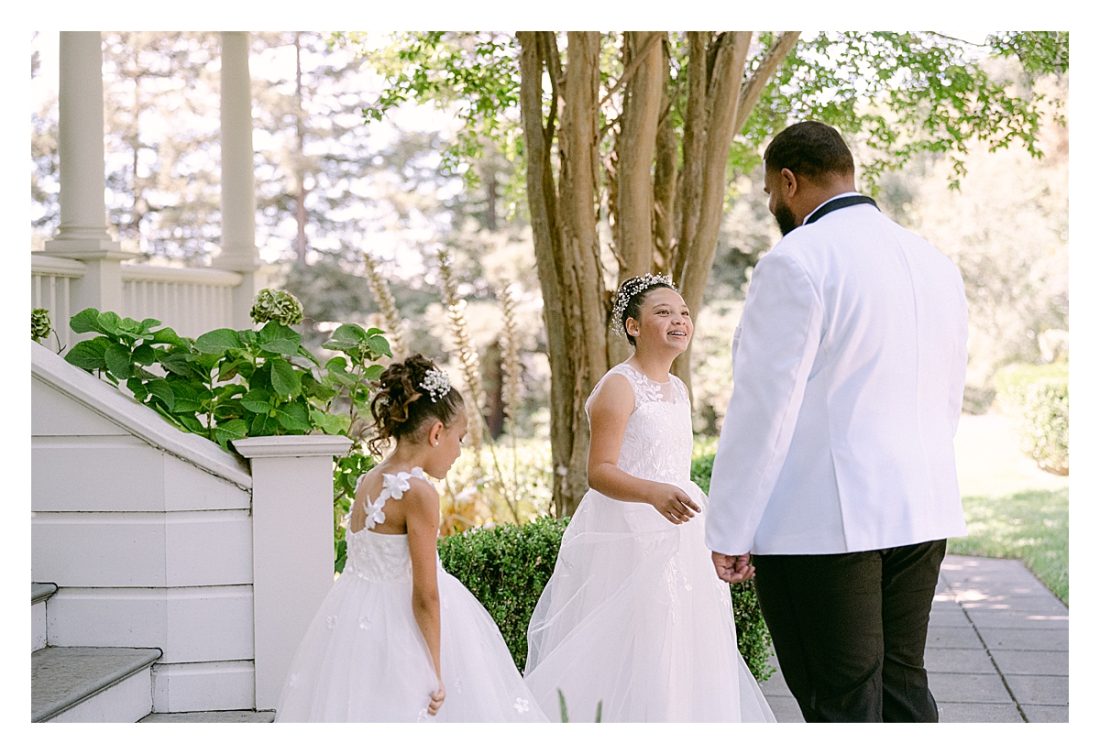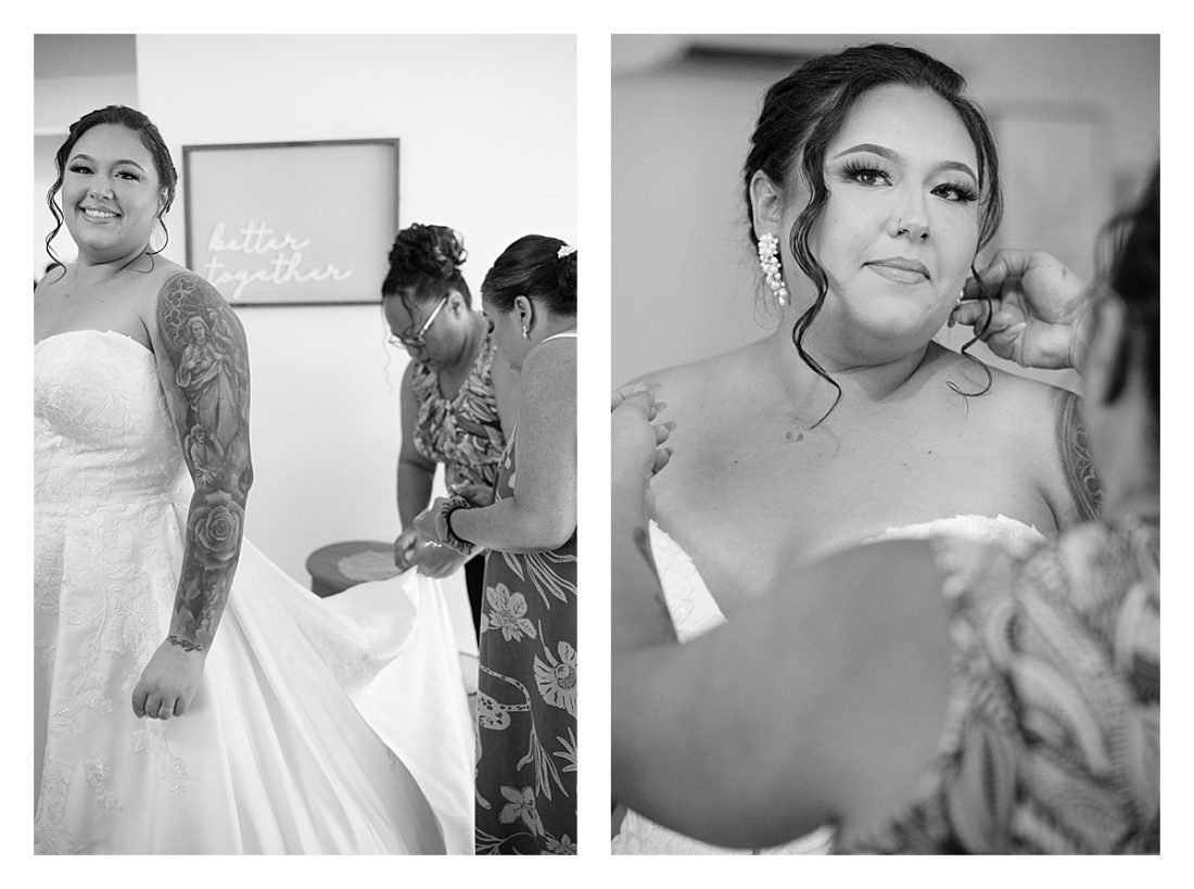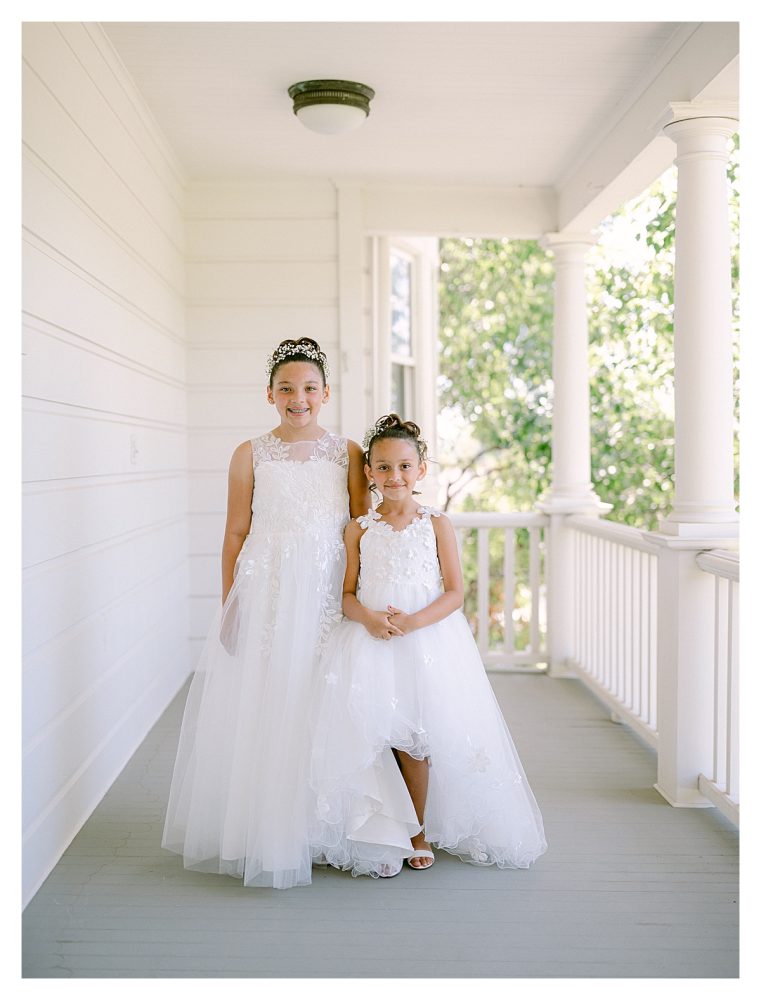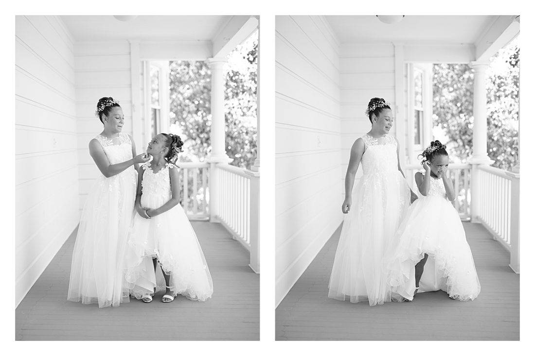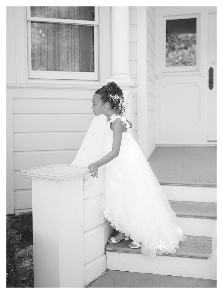 After their wedding ceremony we strolled around the property and captured photos by the mature trees and textured buildings. It was very windy so it was nice to have such beautiful buildings and trees to help block the wind a bit. Kiani made it clear that while she wanted some nice portraits of the two of them and their family, but she prefered photos that documented the moments and the realness of the day. Many brides say that, but then still provide a 3 page shot list and wait on me to direct or stage every minute of their day, but she genuinely meant it. She took in every single moment, whether I was there or not, as it naturally flowed. When I was off photographing her 2 spirited girls (my new besties;) by the Farmhouse she decided it was time to put her gorgeous gown on. I walked in and she was just vibing in the moment with zero photo expectations. I told her, in complete honesty, she was my dream bride!!!