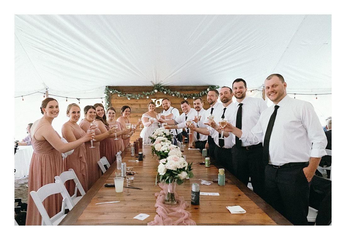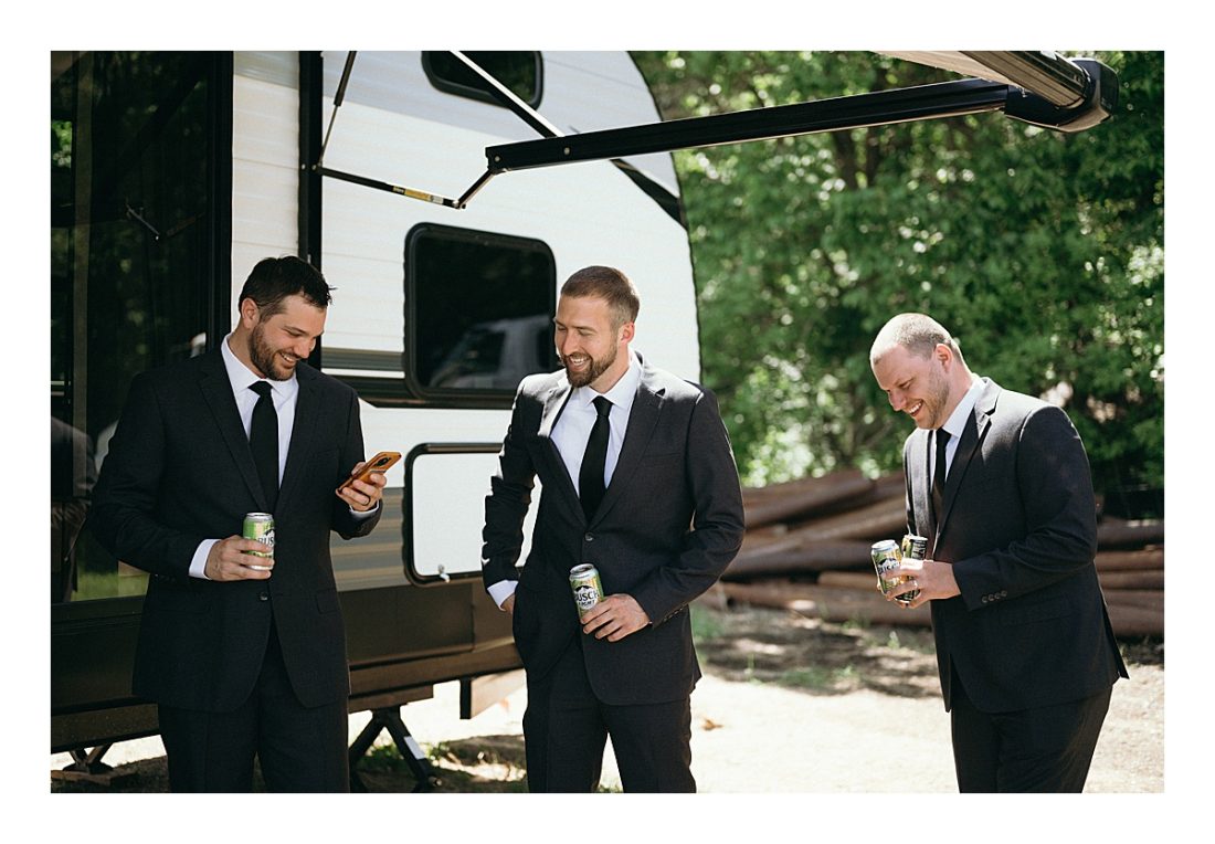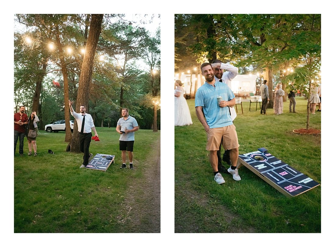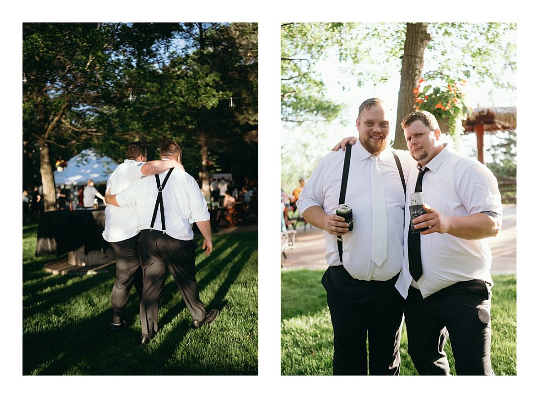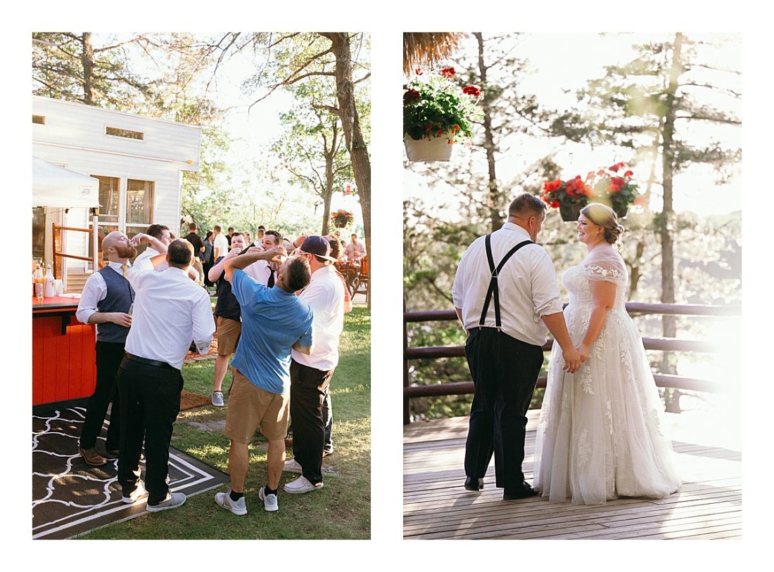 It was a lot of teamwork converting Everette’s family riverside camping and hunting property in Royalton, MN into a full blown wedding venue, but the effort was well worth it. Friends and family gathered under the trees for a sweet little ceremony, before walking the trail or hitching a tractor ride to the custom made reception space. The outdoorsy atmosphere overlooking the river made for an intimate, unique, and FUN experience for all who attended. Guests shared stories around the campfire, took shots by the camper-side bar, played bean bags and danced under the stars long into the evening.