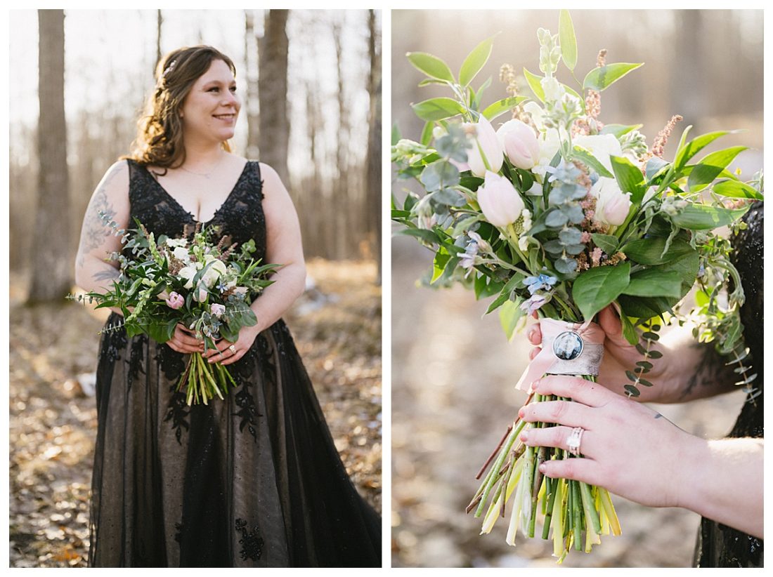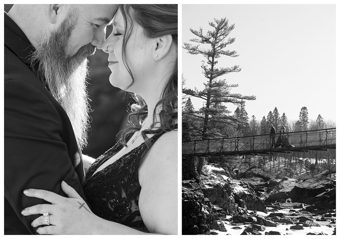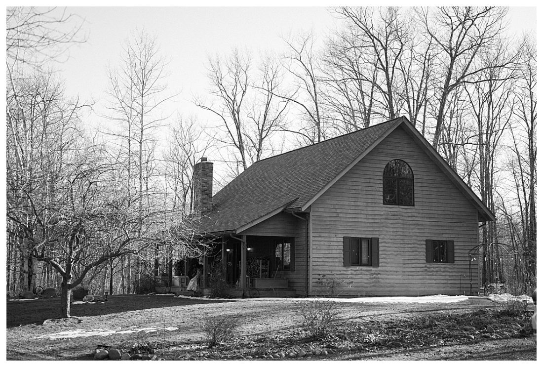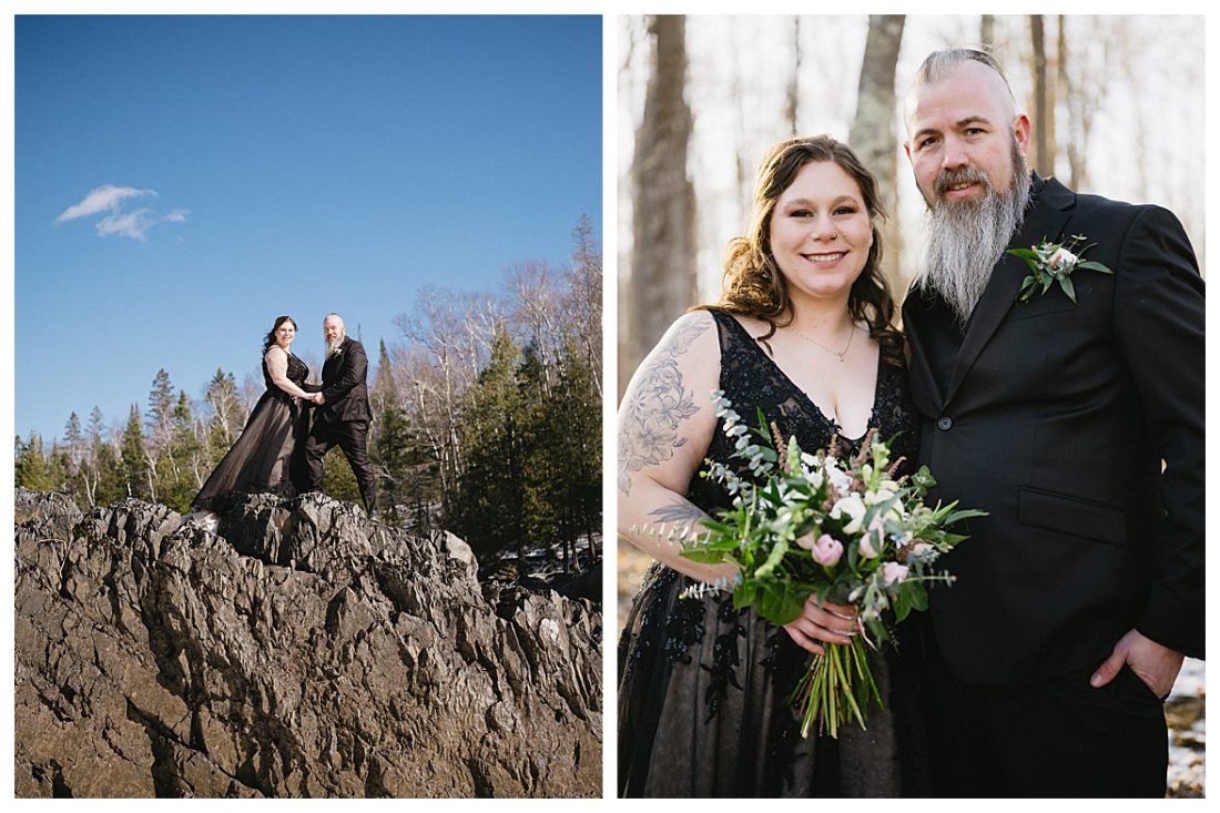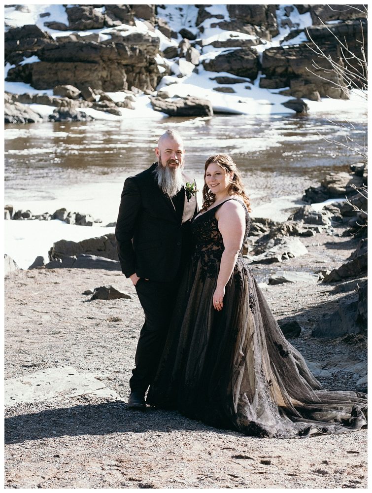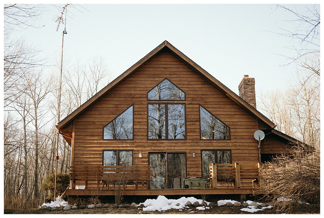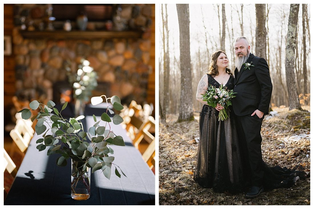 Bethany and Ryan decided an adventurous Micro Wedding in northern Minnesota was the perfect fit for them. They both love Jay Cooke State Park so they found an adorable cabin nearby, Juliane James Place. It is tucked away in the woods in the countryside of Finlayson and suitable to host micro-weddings. I would love to go back and visit this beautiful property in the Summer or Fall, because even in the midst of April when nothing is pretty, it was pretty!! Ryan filled the fireplace with fresh cut wood while Bethany got her hair and makeup done by Nikki Popp. Then he helped her get into her stunning black gown. They later hosted an intimate ceremony overlooking a pond and ended the evening with dinner with friends and family. In between getting ready and the ceremony, they privately exchanged vows at their beloved Jay Cooke State Park.