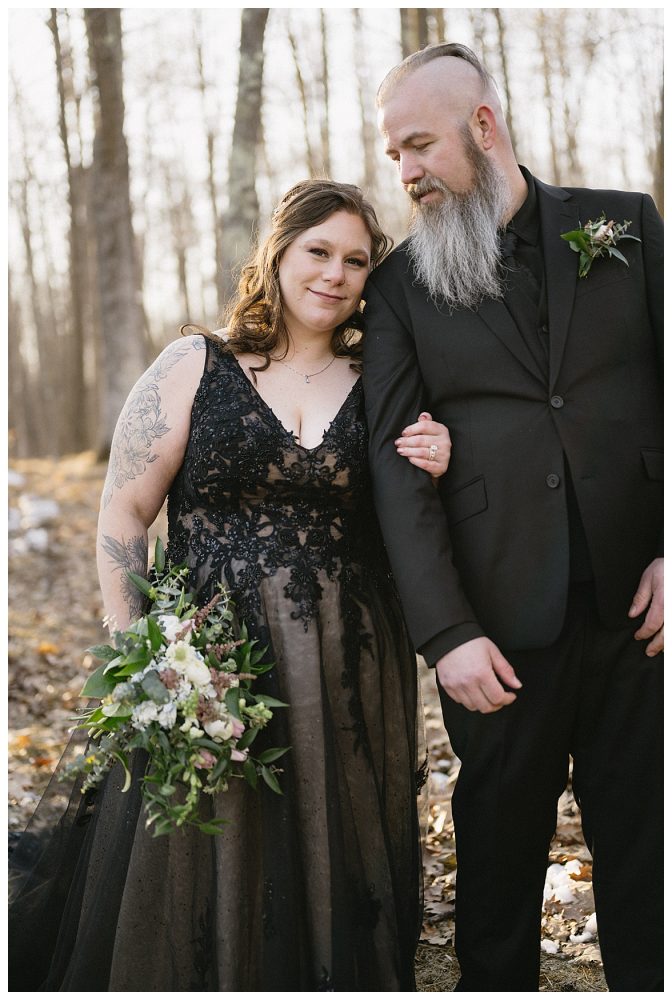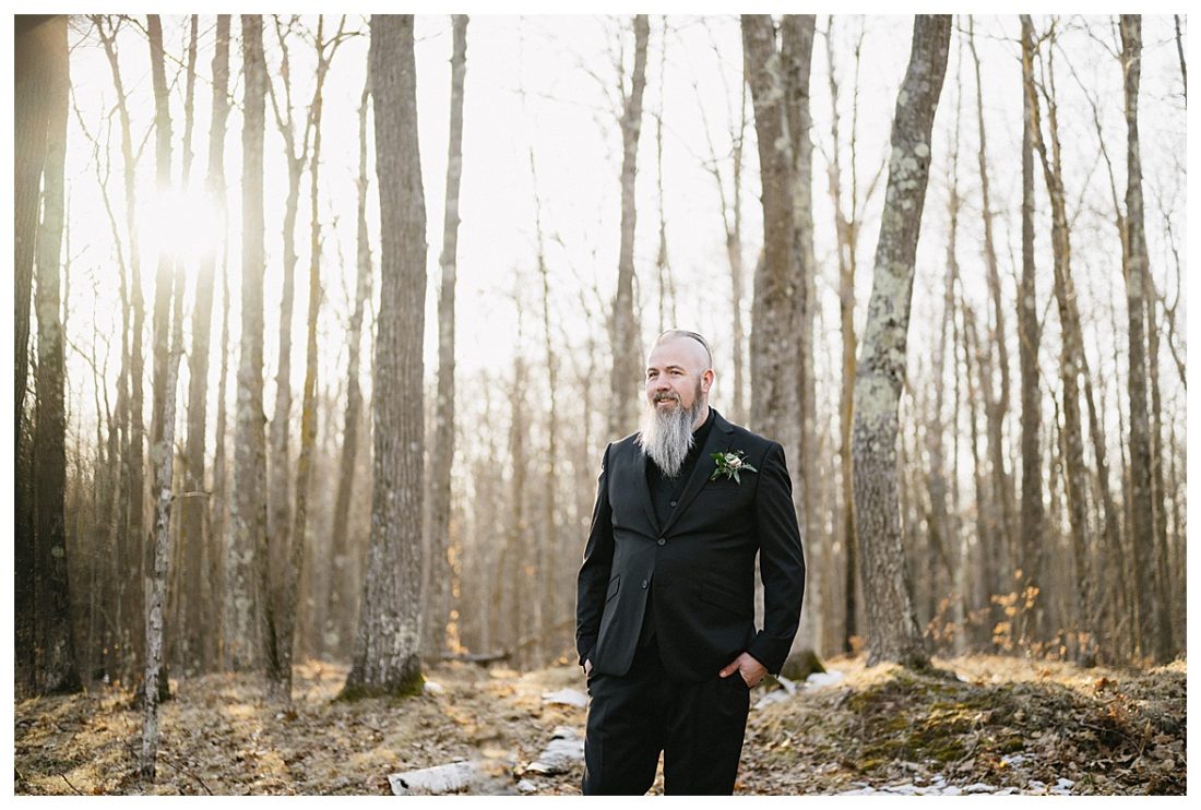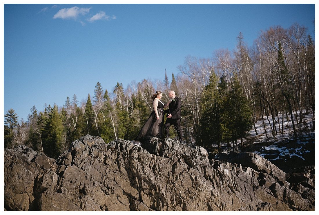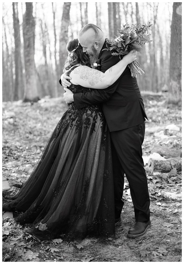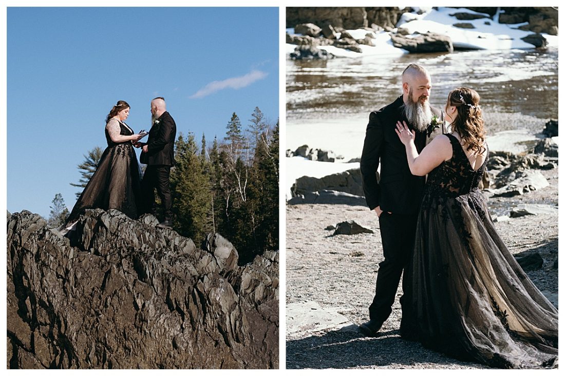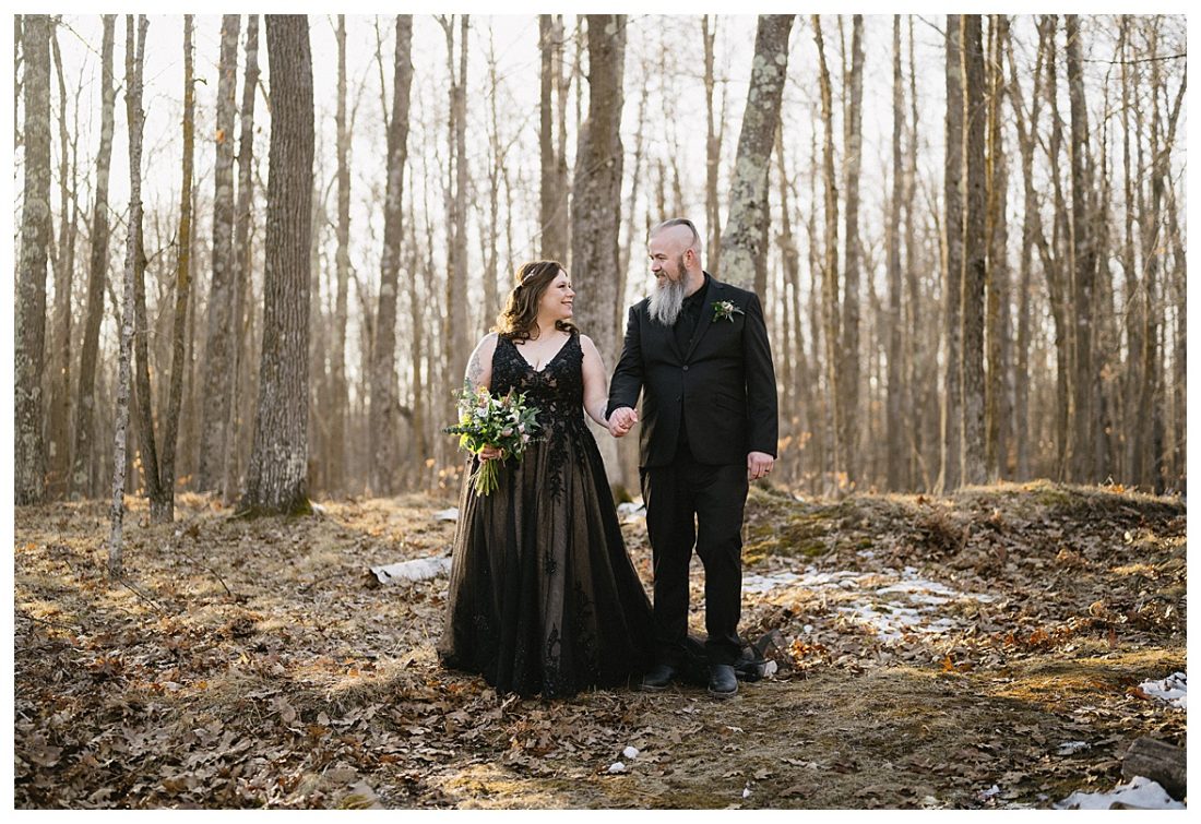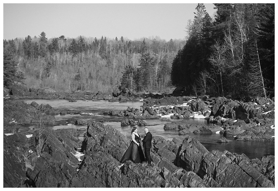 Bethany and Ryan decided an adventurous Micro Wedding in northern Minnesota was the perfect fit for them. They both love Jay Cooke State Park so they found an adorable cabin nearby, Juliane James Place. It is tucked away in the woods in the countryside of Finlayson and suitable to host micro-weddings. I would love to go back and visit this beautiful property in the Summer or Fall, because even in the midst of April when nothing is pretty, it was pretty!! Ryan filled the fireplace with fresh cut wood while Bethany got her hair and makeup done by Nikki Popp. Then he helped her get into her stunning black gown. They later hosted an intimate ceremony overlooking a pond and ended the evening with dinner with friends and family. In between getting ready and the ceremony, they privately exchanged vows at their beloved Jay Cooke State Park.
