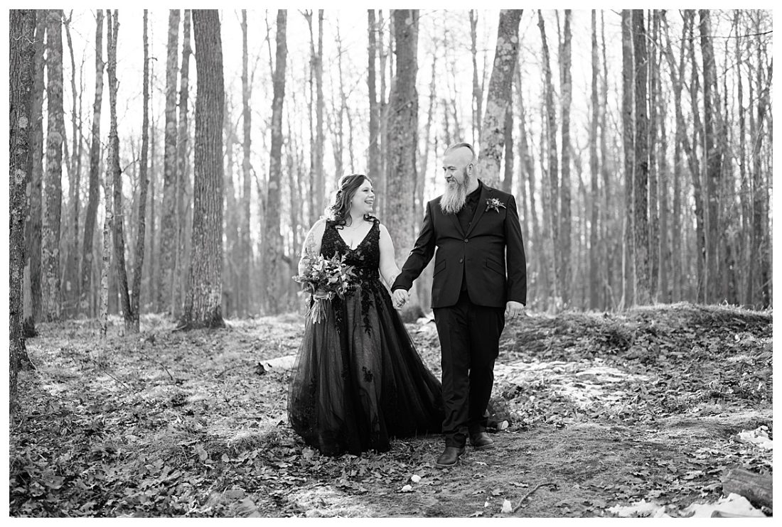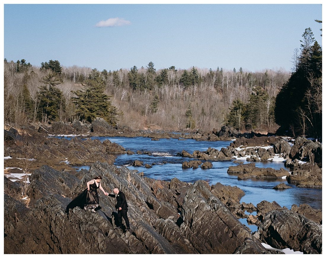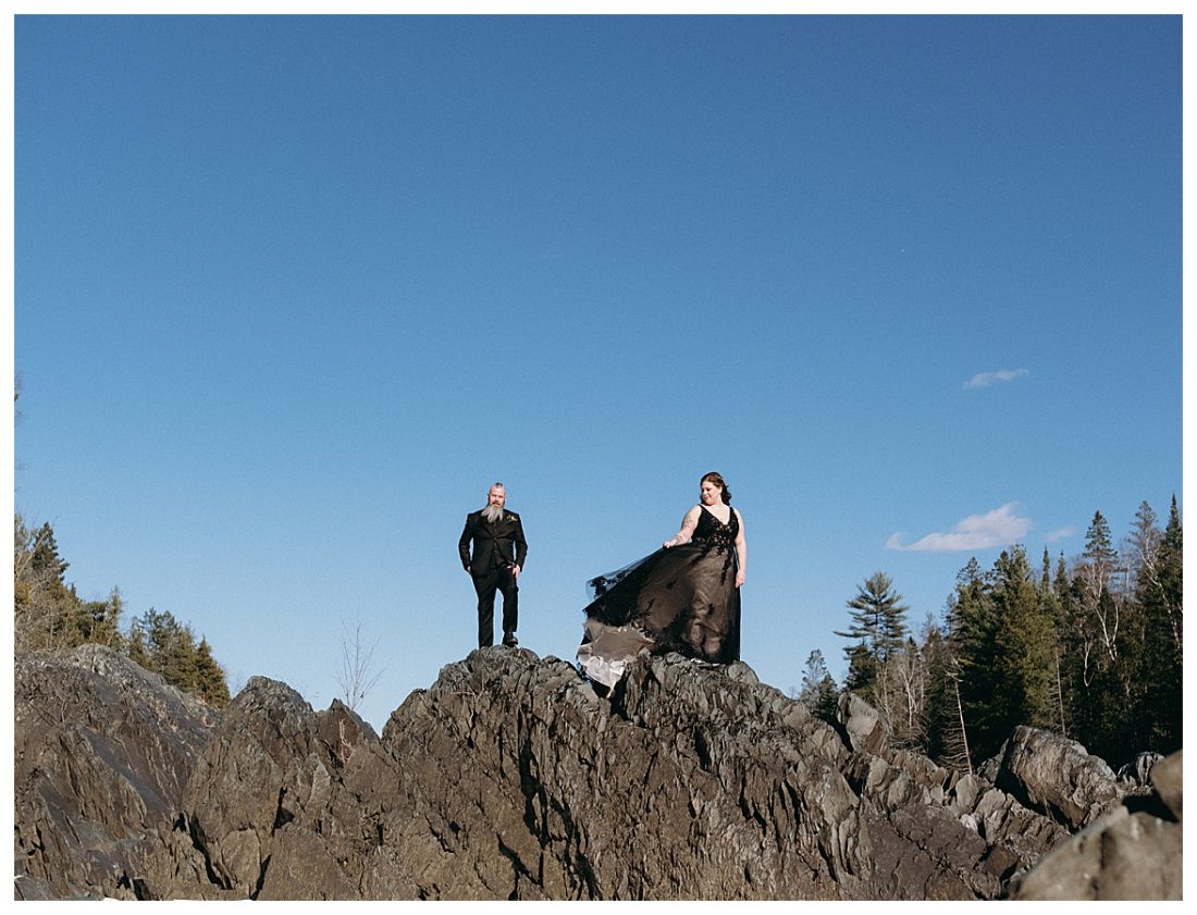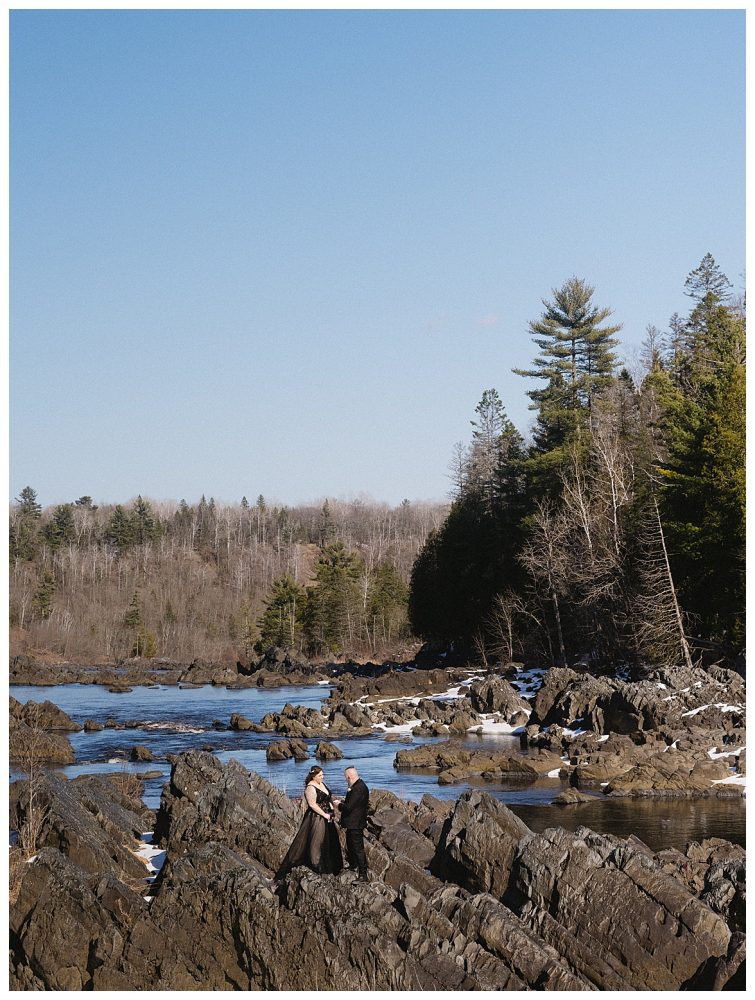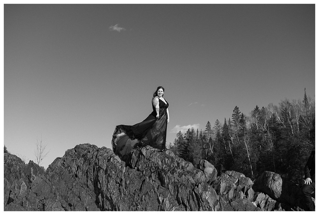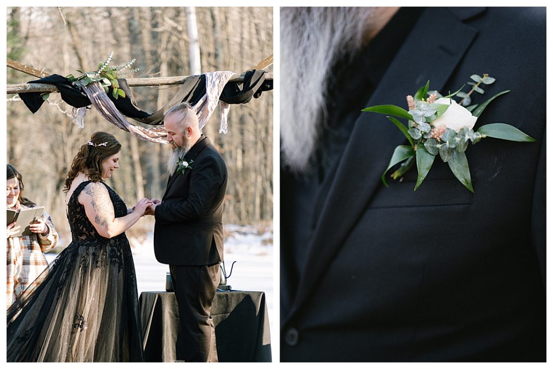 Bethany and Ryan decided an adventurous Micro Wedding in northern Minnesota was the perfect fit for them. They both love Jay Cooke State Park so they found an adorable cabin nearby, Juliane James Place. It is tucked away in the woods in the countryside of Finlayson and suitable to host micro-weddings. I would love to go back and visit this beautiful property in the Summer or Fall, because even in the midst of April when nothing is pretty, it was pretty!! Ryan filled the fireplace with fresh cut wood while Bethany got her hair and makeup done by Nikki Popp. Then he helped her get into her stunning black gown. They later hosted an intimate ceremony overlooking a pond and ended the evening with dinner with friends and family. In between getting ready and the ceremony, they privately exchanged vows at their beloved Jay Cooke State Park.
