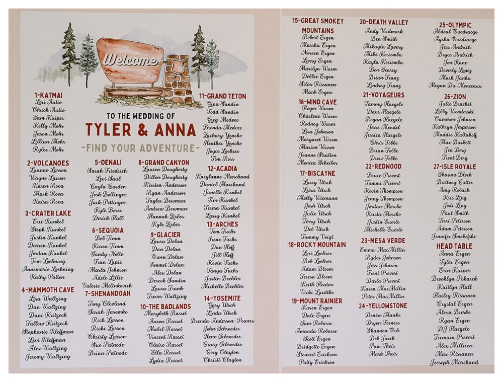 Our national park decor theme was inspired by our love for the outdoors and our drive to continue to explore. We got engaged in Smokey Mountain National Park and we plan on honeymooning next summer in Acadia National Park! We are actually doing a two week road trip to Niagara Falls, Boston, Salem, Camden, Bar Harbor and Acadia National Park. I have been to many National Parks and cannot wait to share new experiences with Tyler as we explore many more National Parks in our marriage.