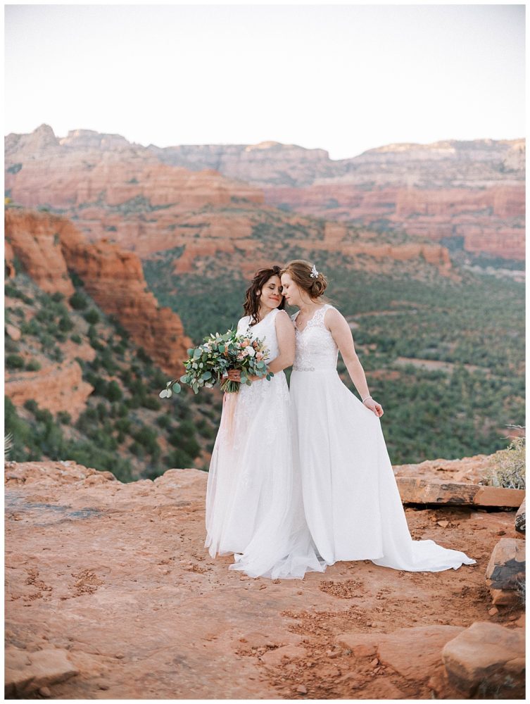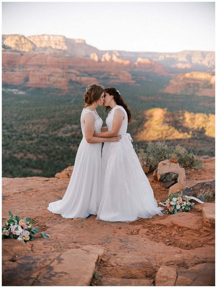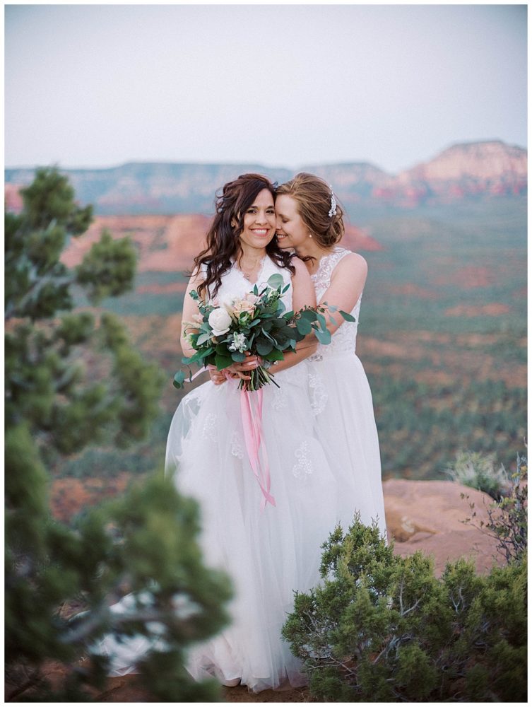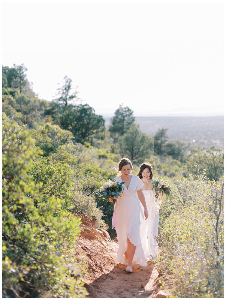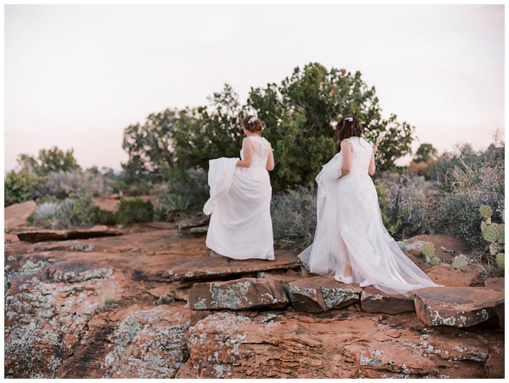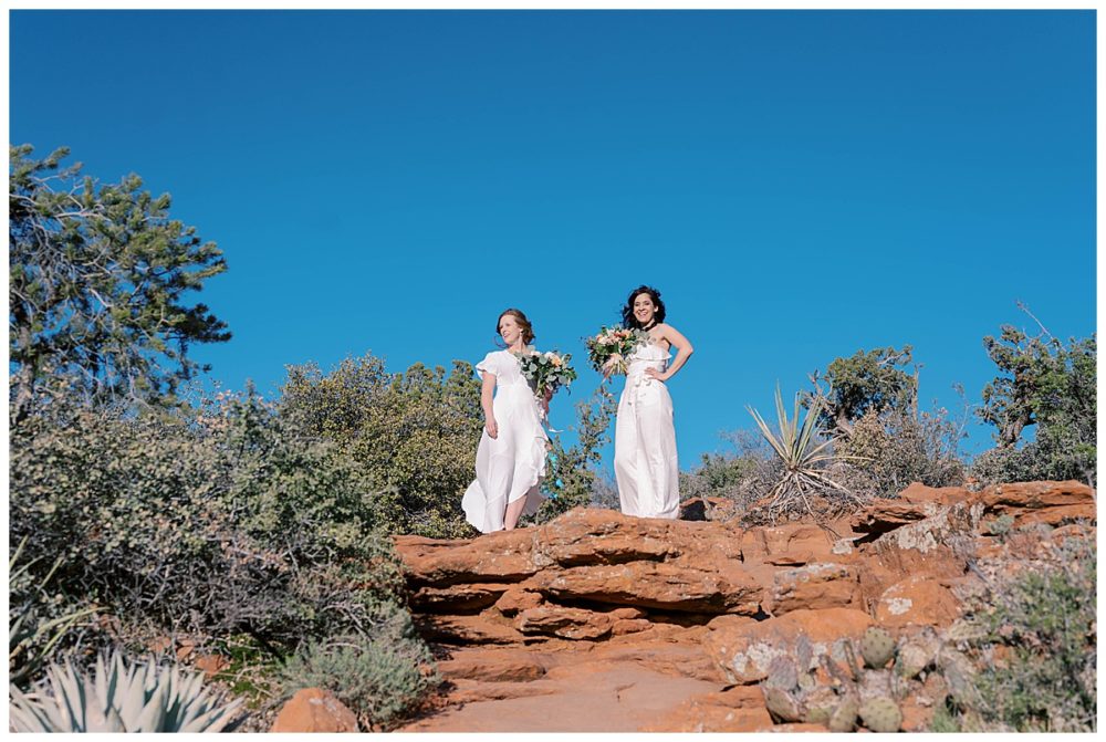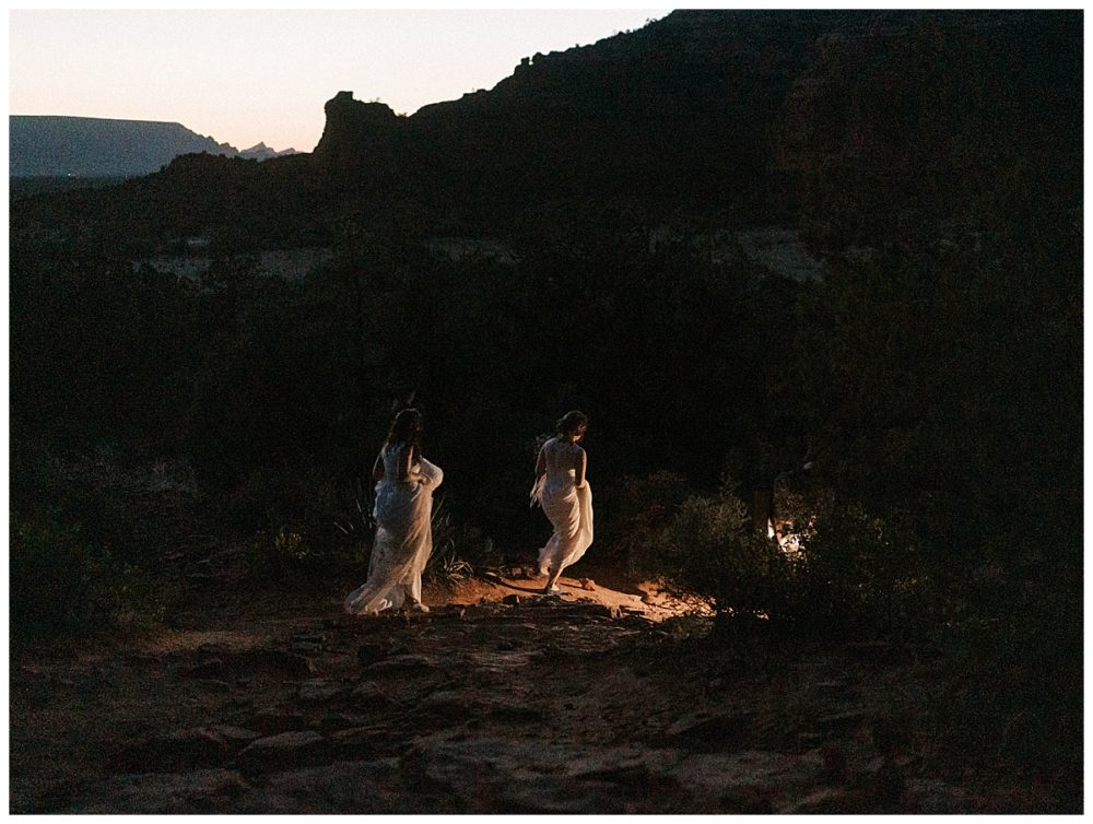 Stephanie and Stephanie (yes you read that right;) have been on a whirlwind adventure since they met 8 years ago, so having an adventurous elopement in Sedona seemed to be the perfect fit for them!! We started the evening at their quaint airbnb right in the heart of Sedona. After a few final touches getting ready, we drove to Cornville for some wine tasting and yummy bruschetta at Page Cellars Vineyard. Then back to Sedona we went for a nice hike up a mountain. At the top, the ladies swapped out their first comfy outfits for more formal wedding gowns, utilizing nature as their own private dressing room. They exchanged vows overlooking the valley and shared a first dance and kiss at sunset before hiking back down in the dark.