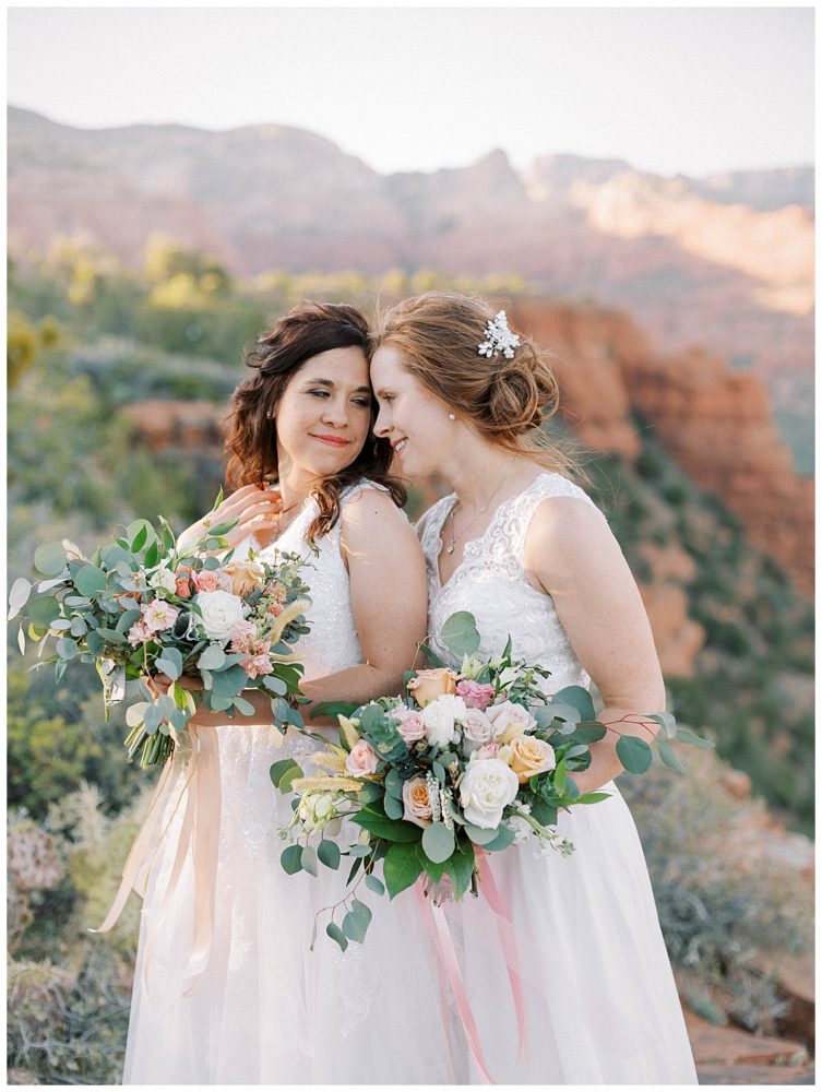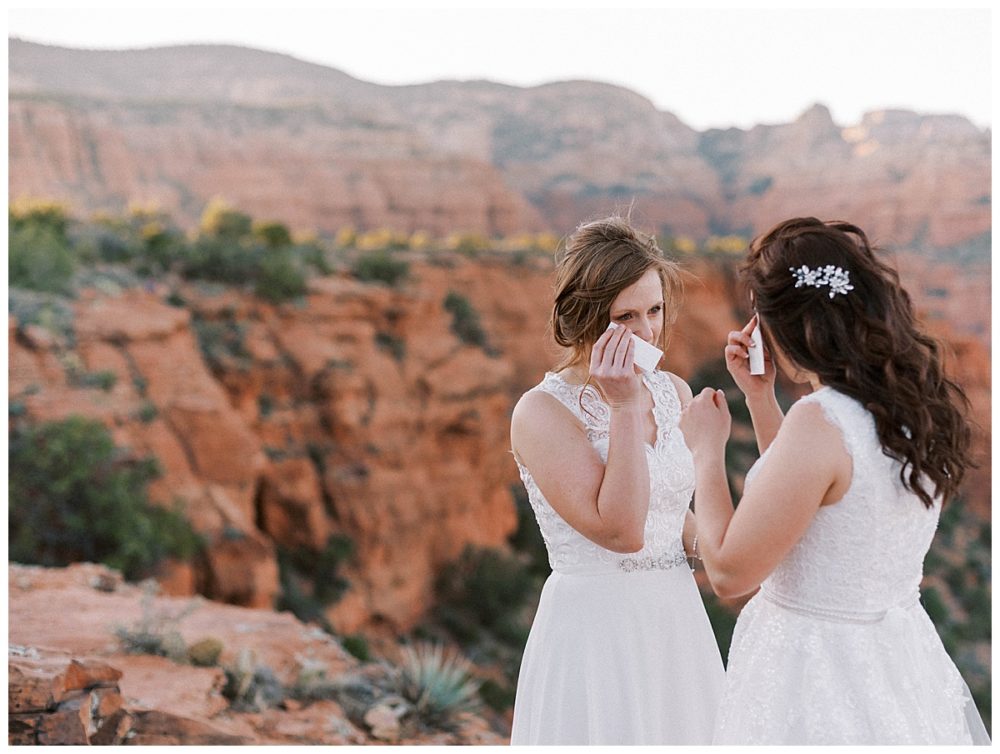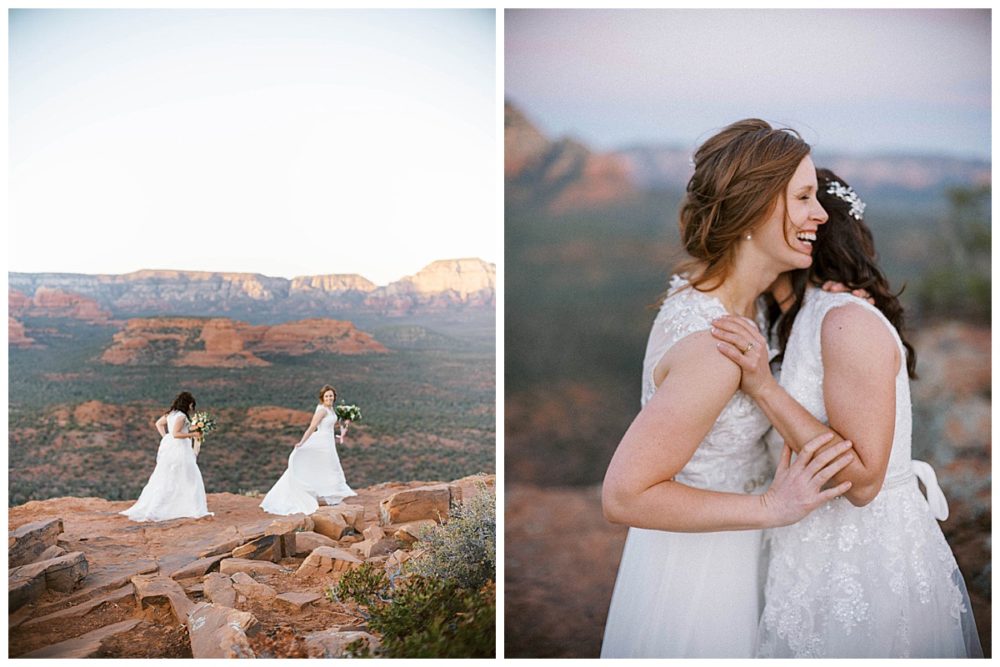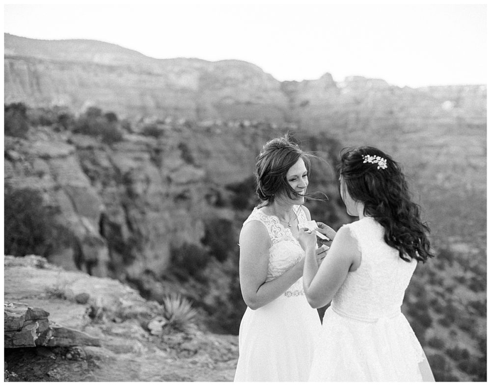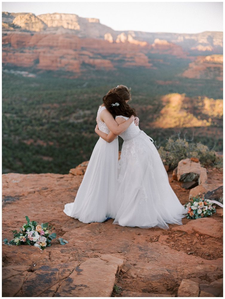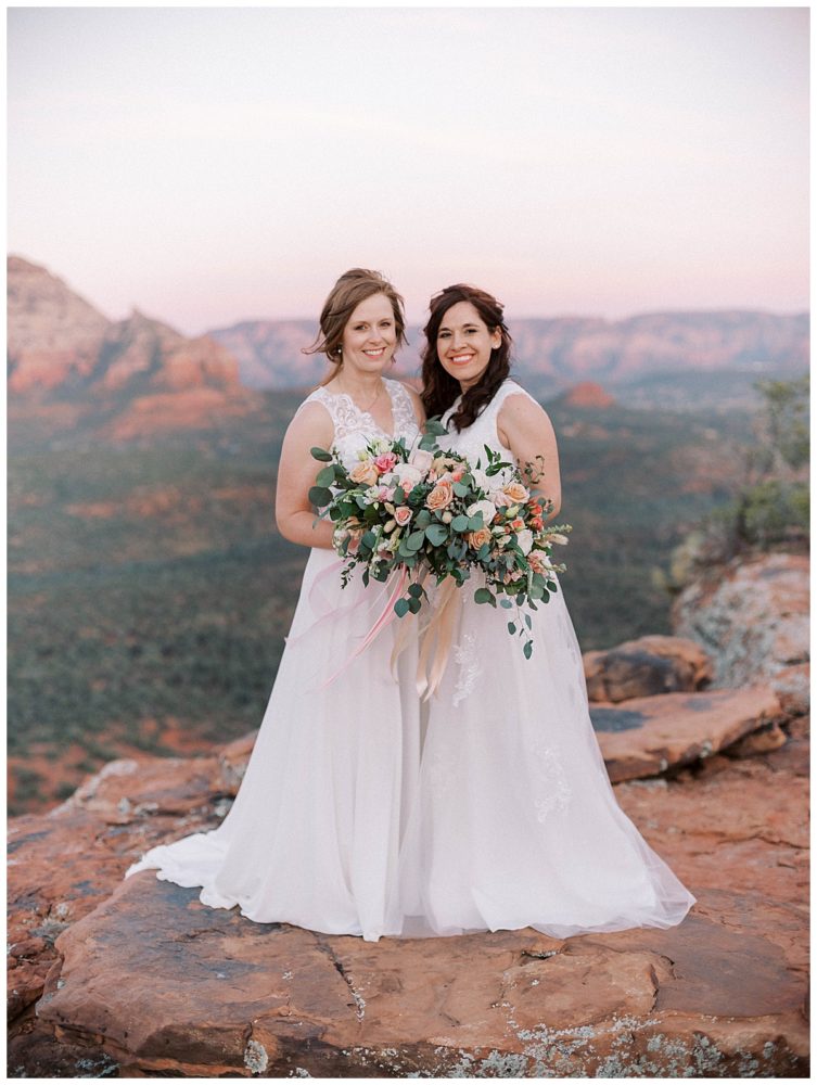 Stephanie and Stephanie (yes you read that right;) have been on a whirlwind adventure since they met 8 years ago, so having an adventurous elopement in Sedona seemed to be the perfect fit for them!! We started the evening at their quaint airbnb right in the heart of Sedona. After a few final touches getting ready, we drove to Cornville for some wine tasting and yummy bruschetta at Page Cellars Vineyard. Then back to Sedona we went for a nice hike up a mountain. At the top, the ladies swapped out their first comfy outfits for more formal wedding gowns, utilizing nature as their own private dressing room. They exchanged vows overlooking the valley and shared a first dance and kiss at sunset before hiking back down in the dark.