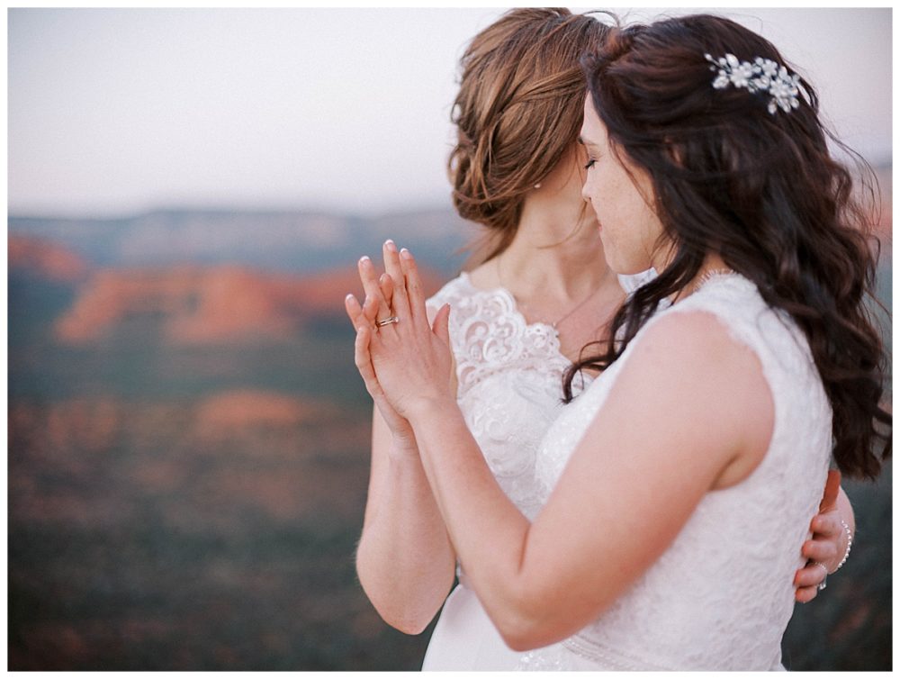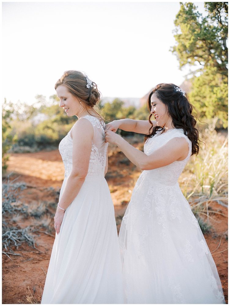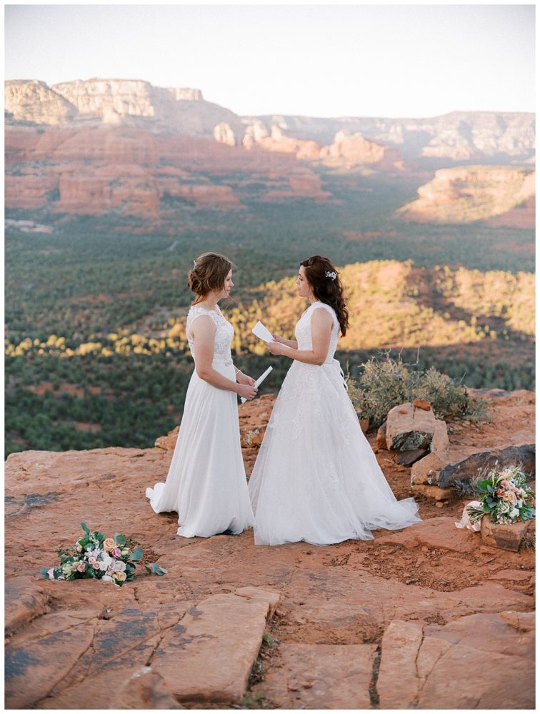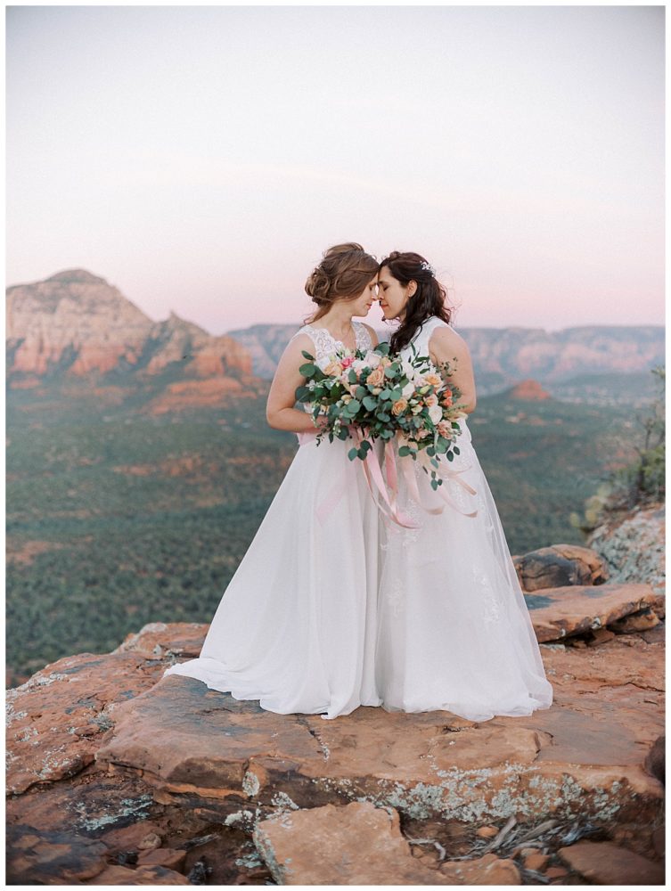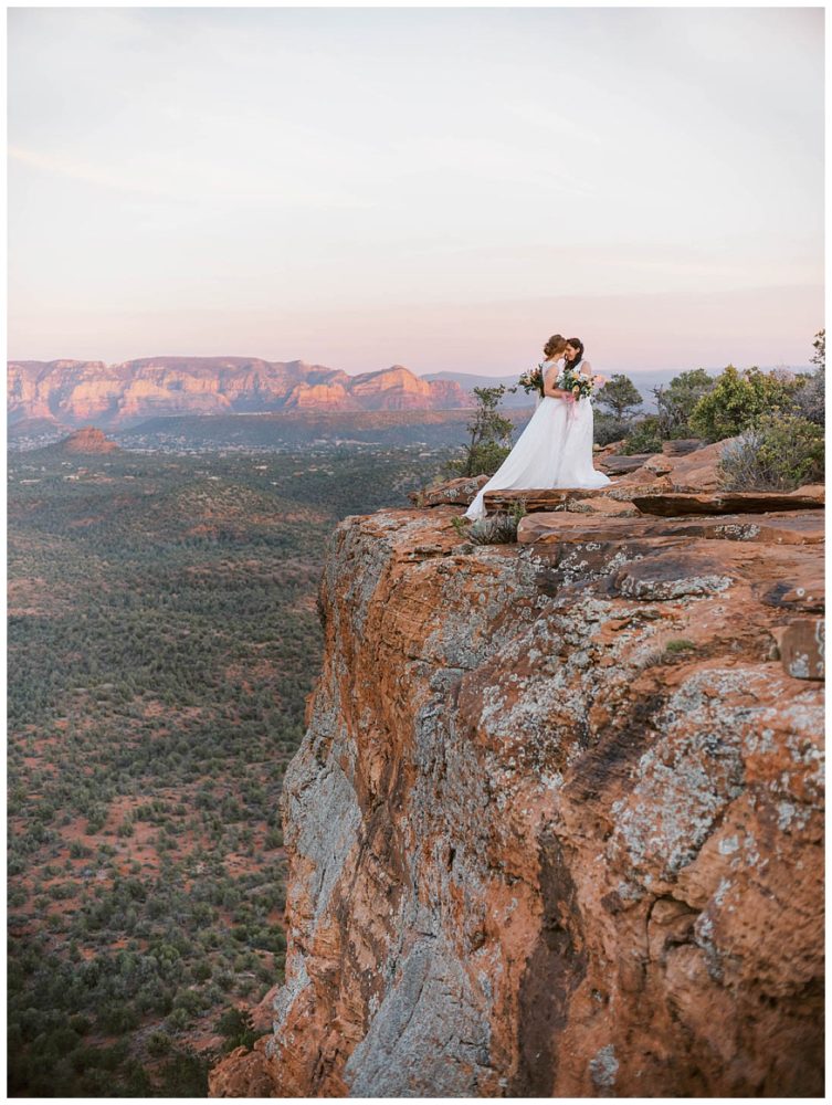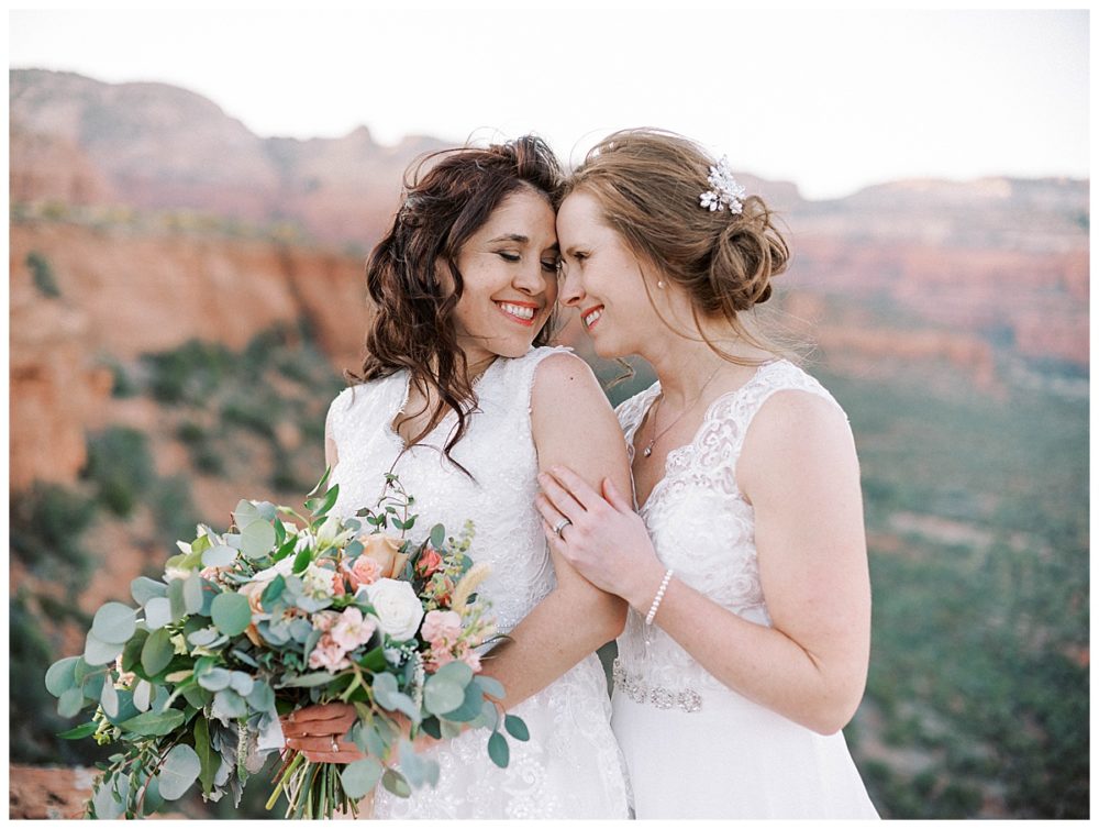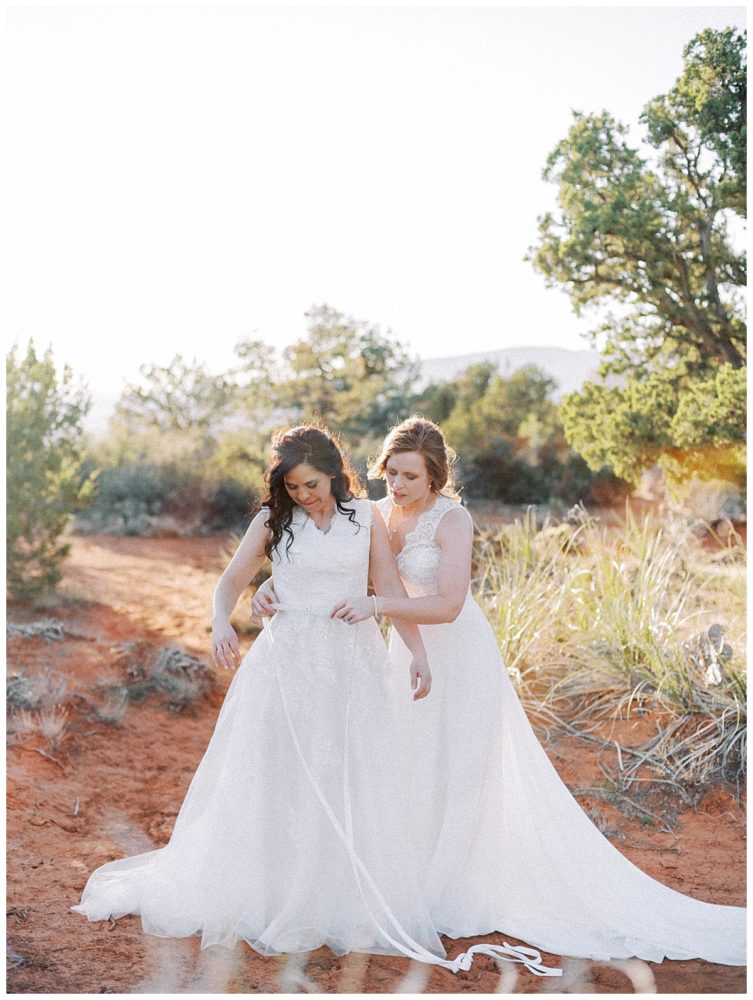 Stephanie and Stephanie (yes you read that right;) have been on a whirlwind adventure since they met 8 years ago, so having an adventurous elopement in Sedona seemed to be the perfect fit for them!! We started the evening at their quaint airbnb right in the heart of Sedona. After a few final touches getting ready, we drove to Cornville for some wine tasting and yummy bruschetta at Page Cellars Vineyard. Then back to Sedona we went for a nice hike up a mountain. At the top, the ladies swapped out their first comfy outfits for more formal wedding gowns, utilizing nature as their own private dressing room. They exchanged vows overlooking the valley and shared a first dance and kiss at sunset before hiking back down in the dark.