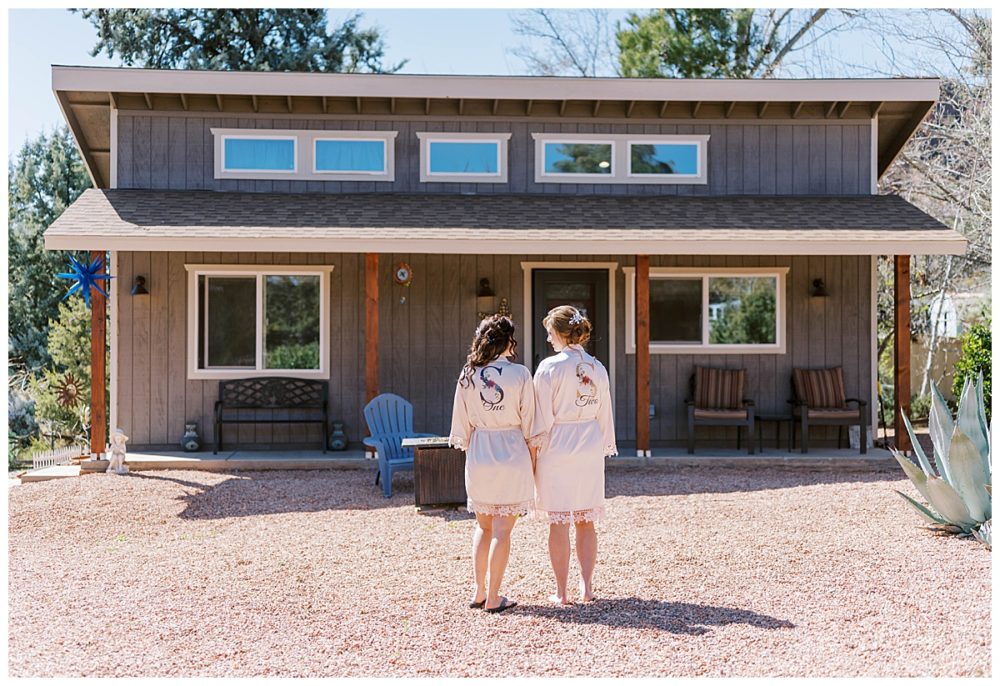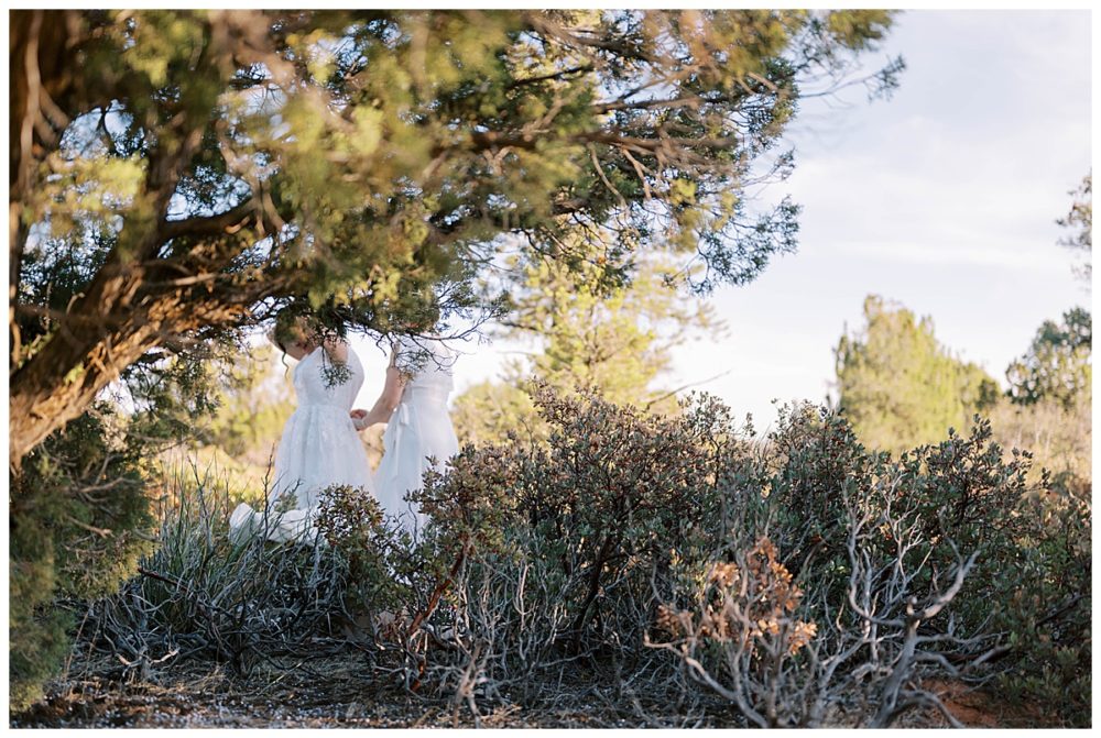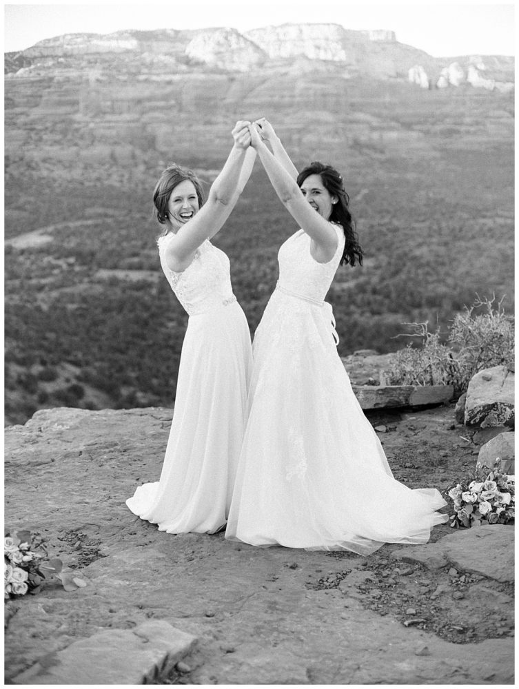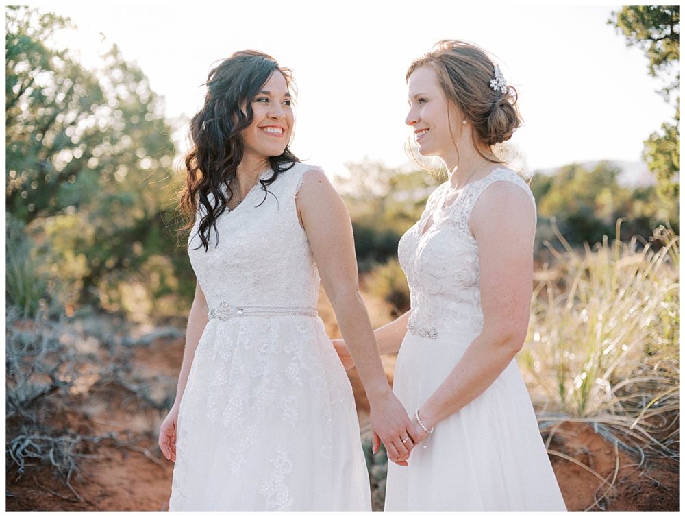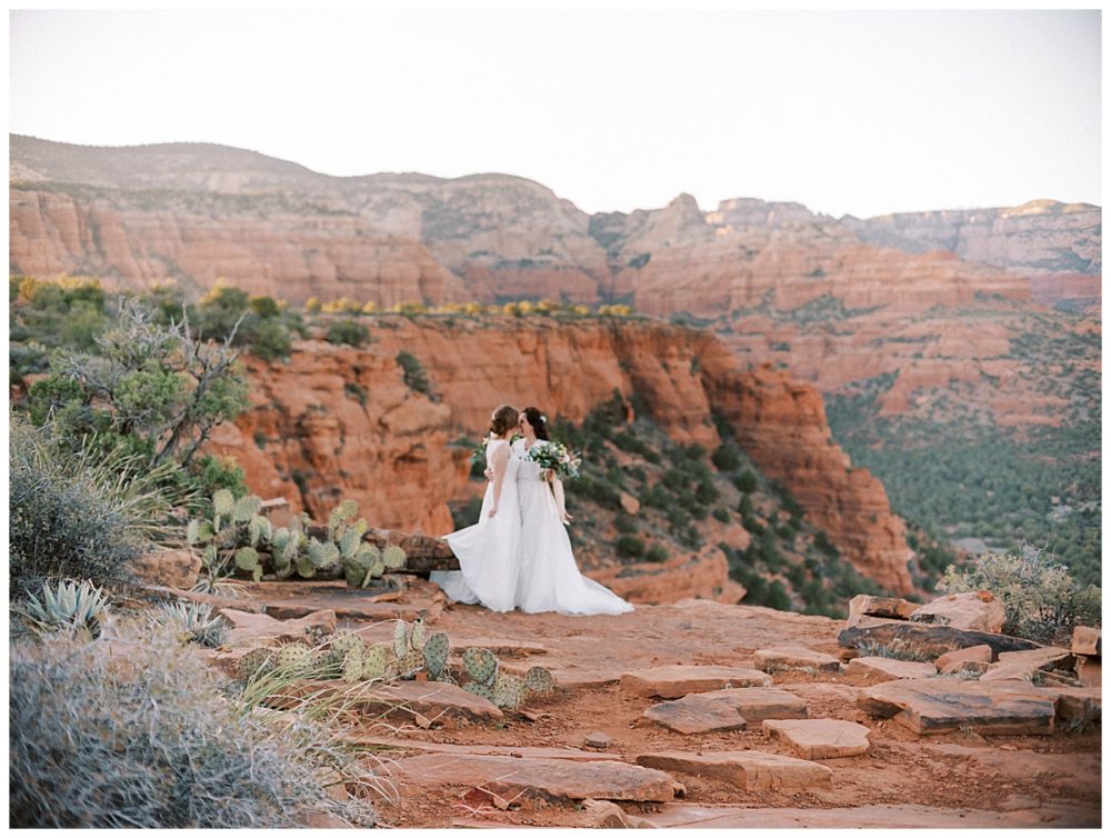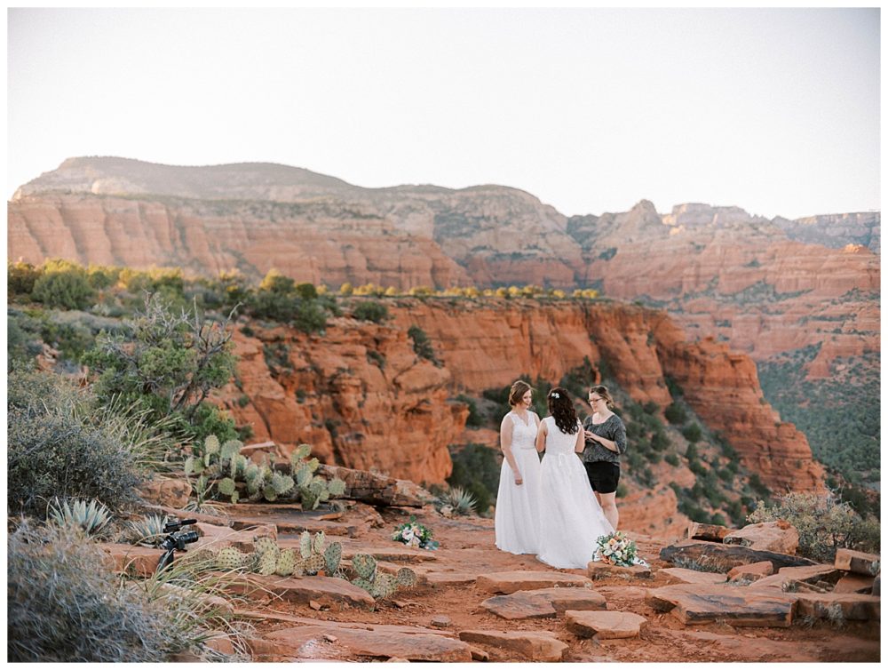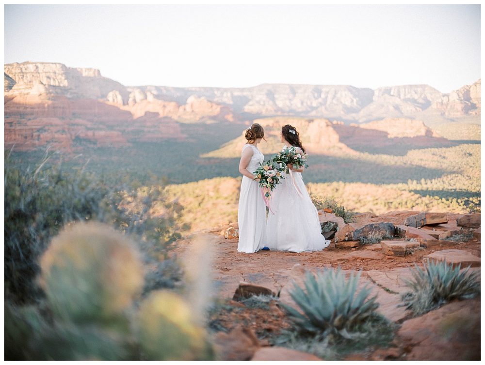 Stephanie and Stephanie (yes you read that right;) have been on a whirlwind adventure since they met 8 years ago, so having an adventurous elopement in Sedona seemed to be the perfect fit for them!! We started the evening at their quaint airbnb right in the heart of Sedona. After a few final touches getting ready, we drove to Cornville for some wine tasting and yummy bruschetta at Page Cellars Vineyard. Then back to Sedona we went for a nice hike up a mountain. At the top, the ladies swapped out their first comfy outfits for more formal wedding gowns, utilizing nature as their own private dressing room. They exchanged vows overlooking the valley and shared a first dance and kiss at sunset before hiking back down in the dark.