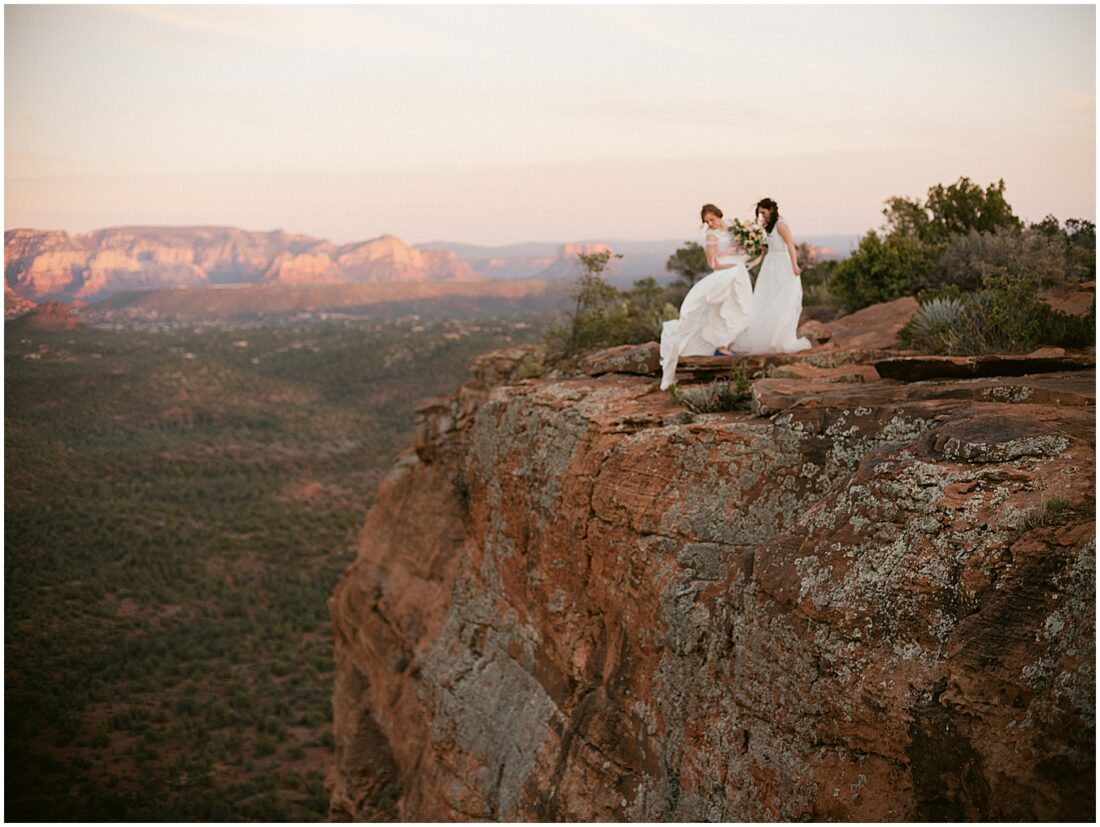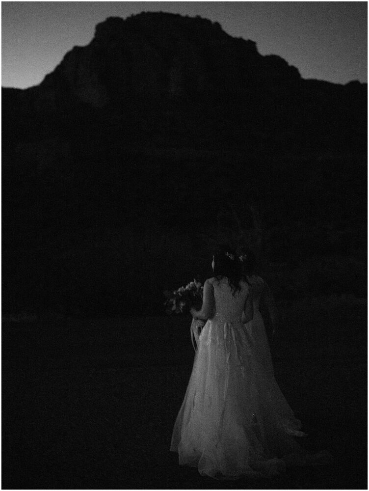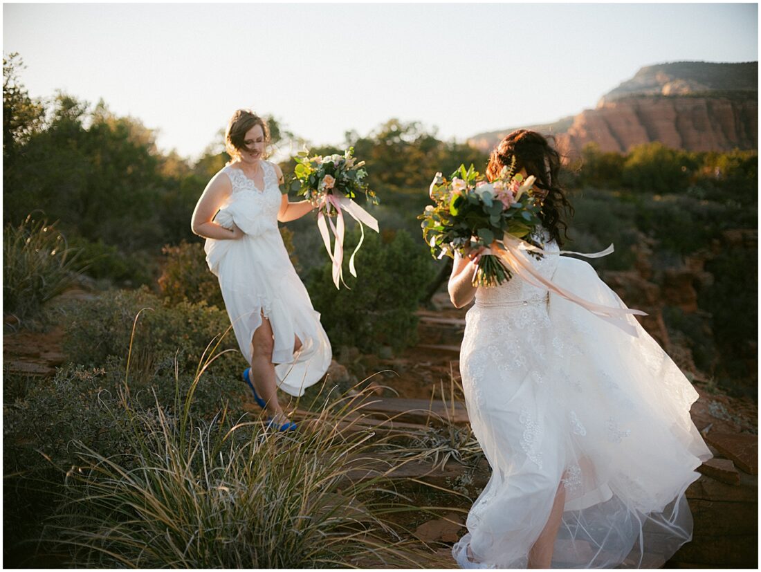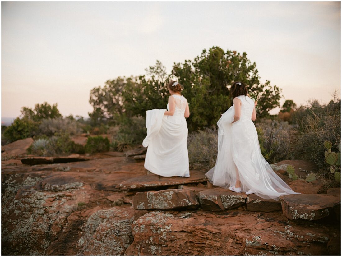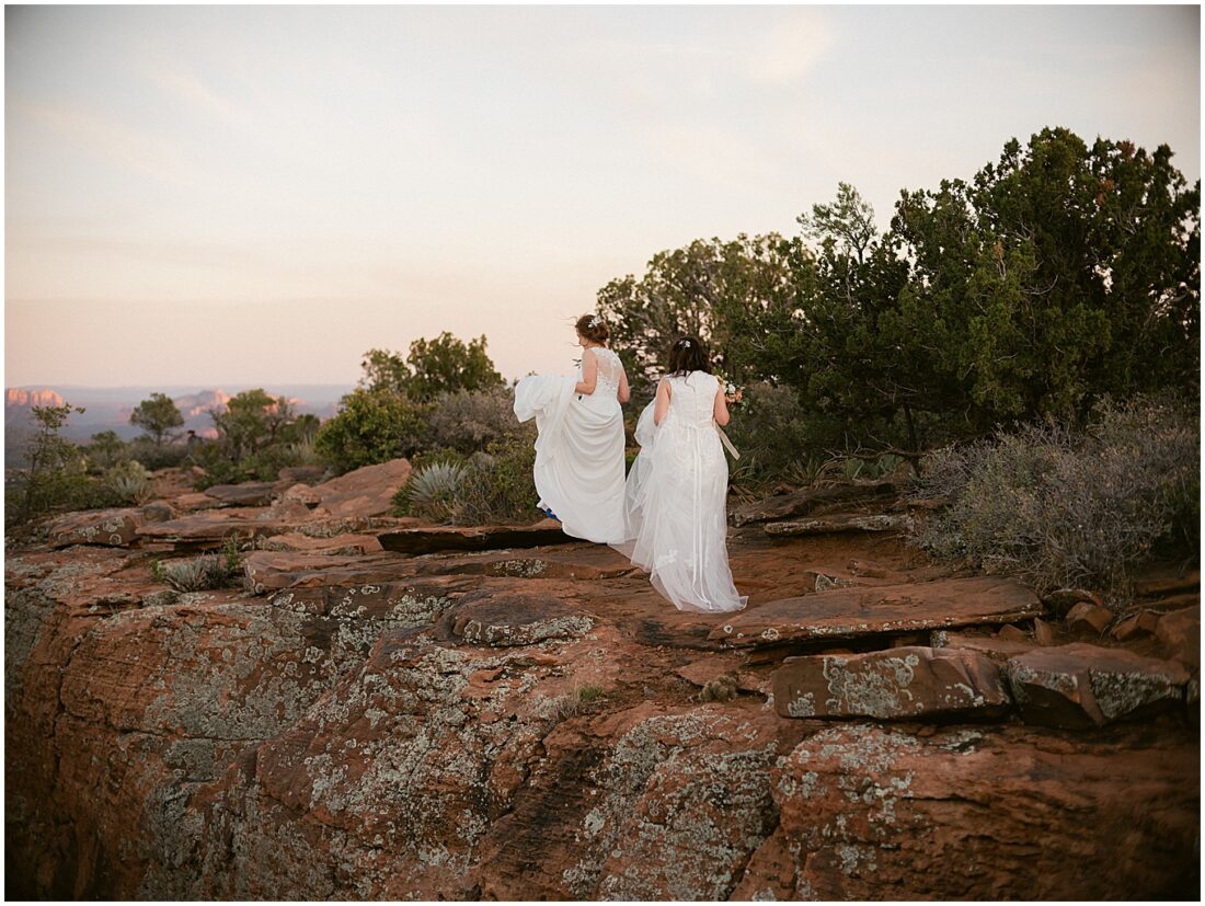 This hike is suitable for an elopement because it’s easy enough to do without breaking a sweat, but challenging enough to feel proud when you reach the top. What better way to begin the next chapter of life then with a sense of accomplishment! At the top, the two lovely brides swapped out their comfy bridal outfits for more formal wedding gowns. The desert shrubs made for the perfect make-shift dressing room. After a few laughs and some time to take in the views, they exchanged vows overlooking the valley. As the sun set below the horizon, we began the hike back down in the dark with only our cell phones to light the way.