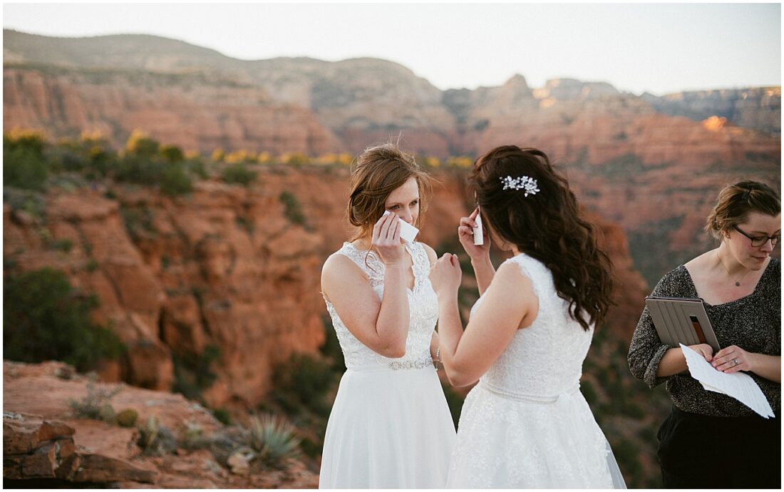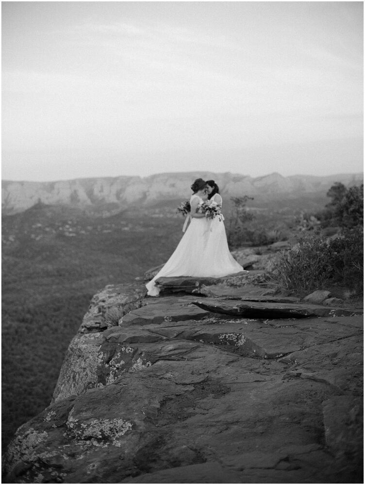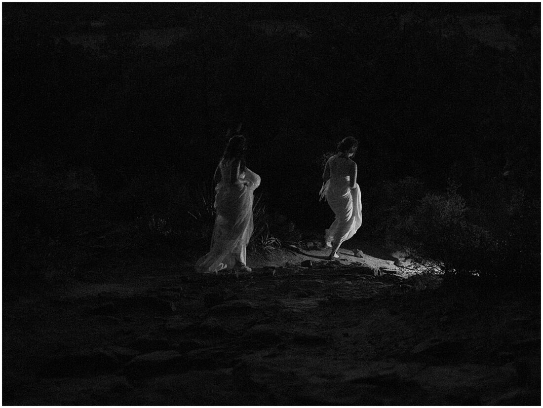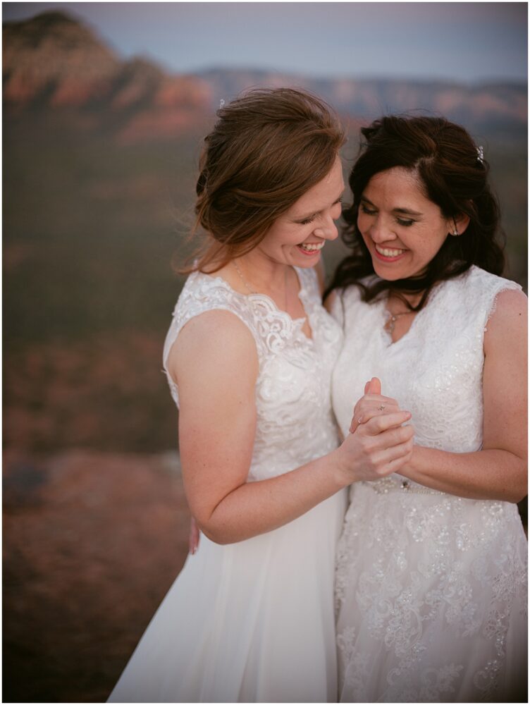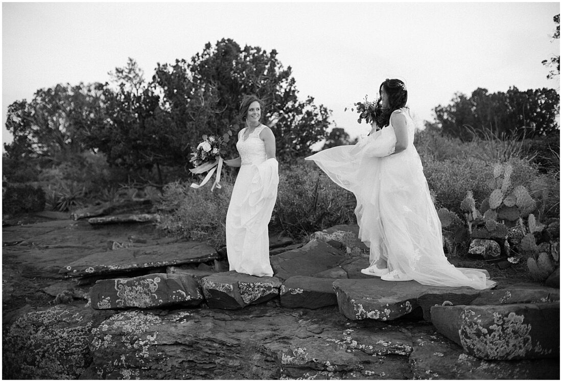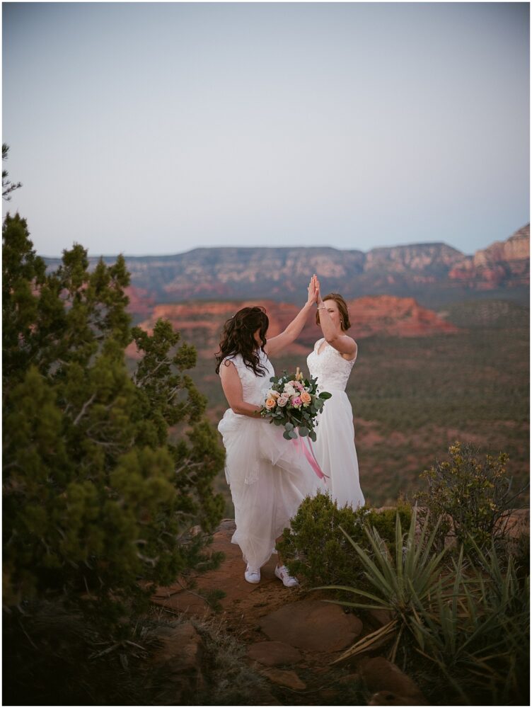 This hike is suitable for an elopement because it’s easy enough to do without breaking a sweat, but challenging enough to feel proud when you reach the top. What better way to begin the next chapter of life then with a sense of accomplishment! At the top, the two lovely brides swapped out their comfy bridal outfits for more formal wedding gowns. The desert shrubs made for the perfect make-shift dressing room. After a few laughs and some time to take in the views, they exchanged vows overlooking the valley. As the sun set below the horizon, we began the hike back down in the dark with only our cell phones to light the way.