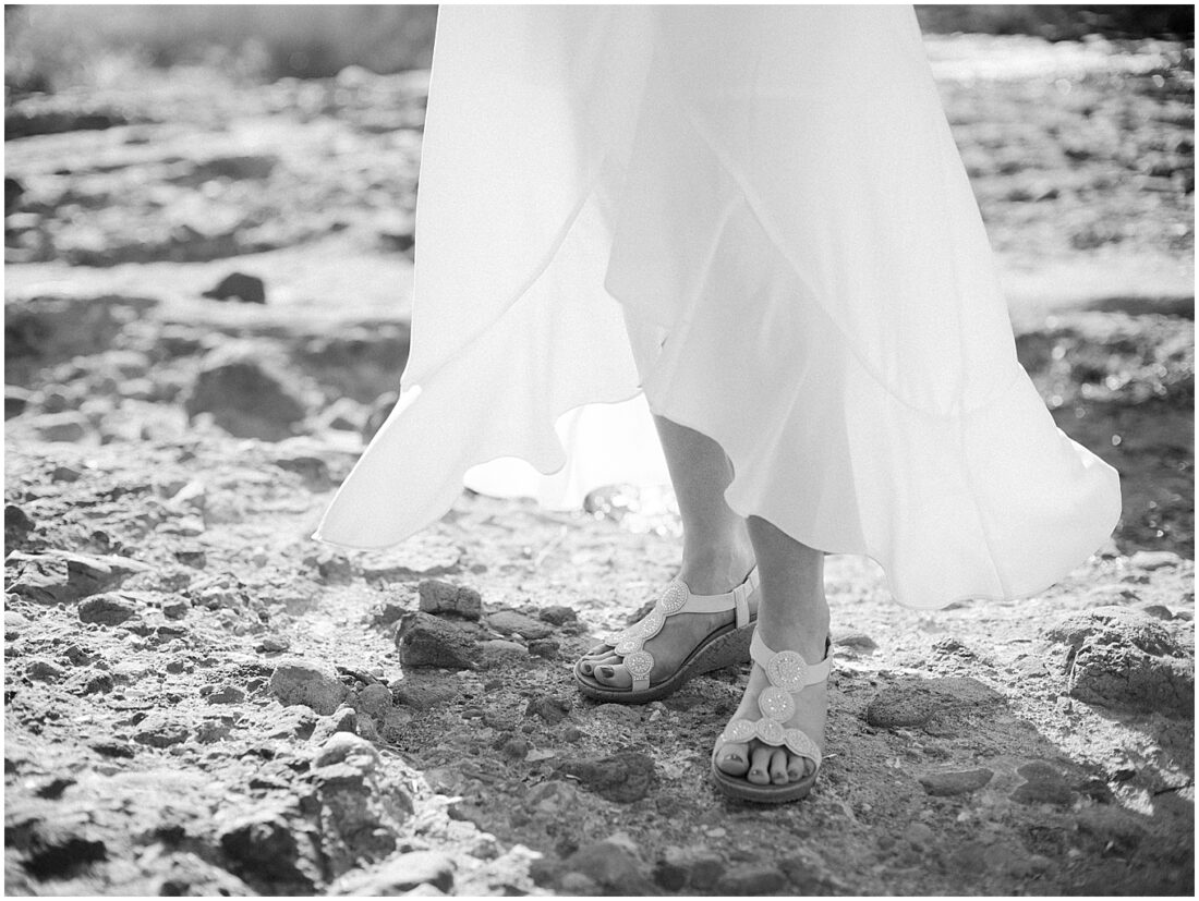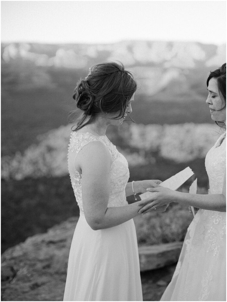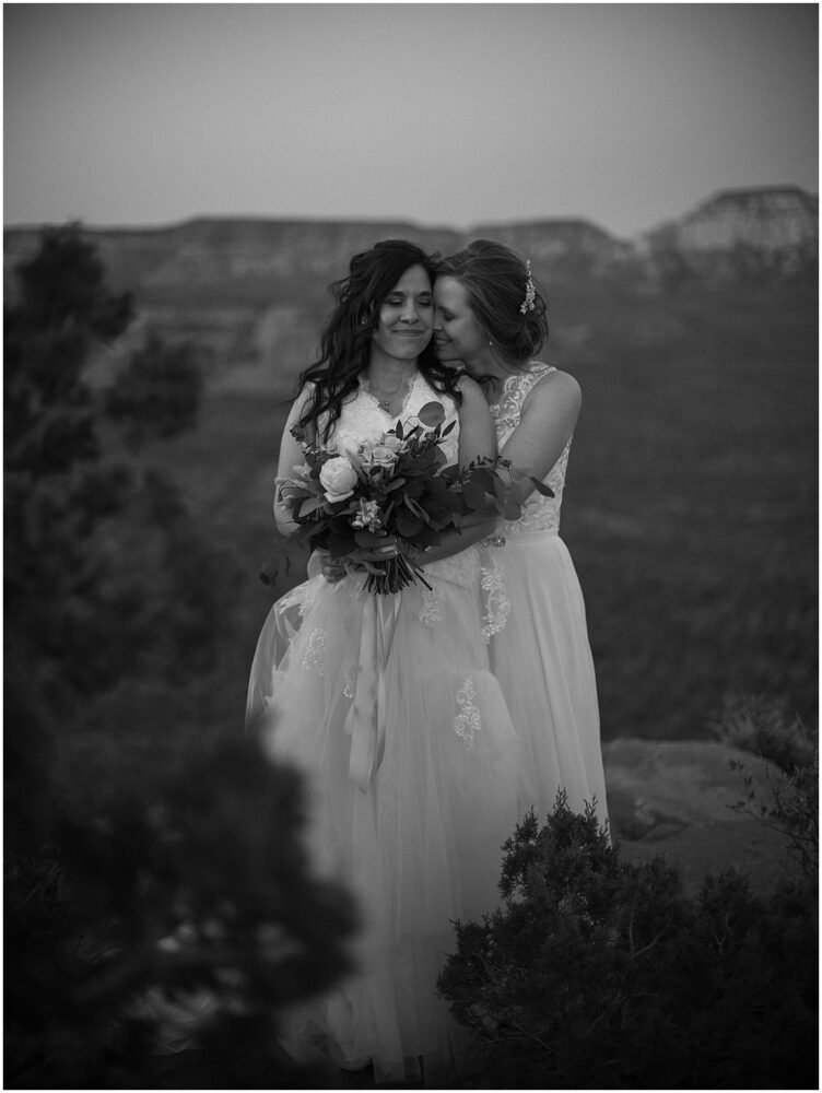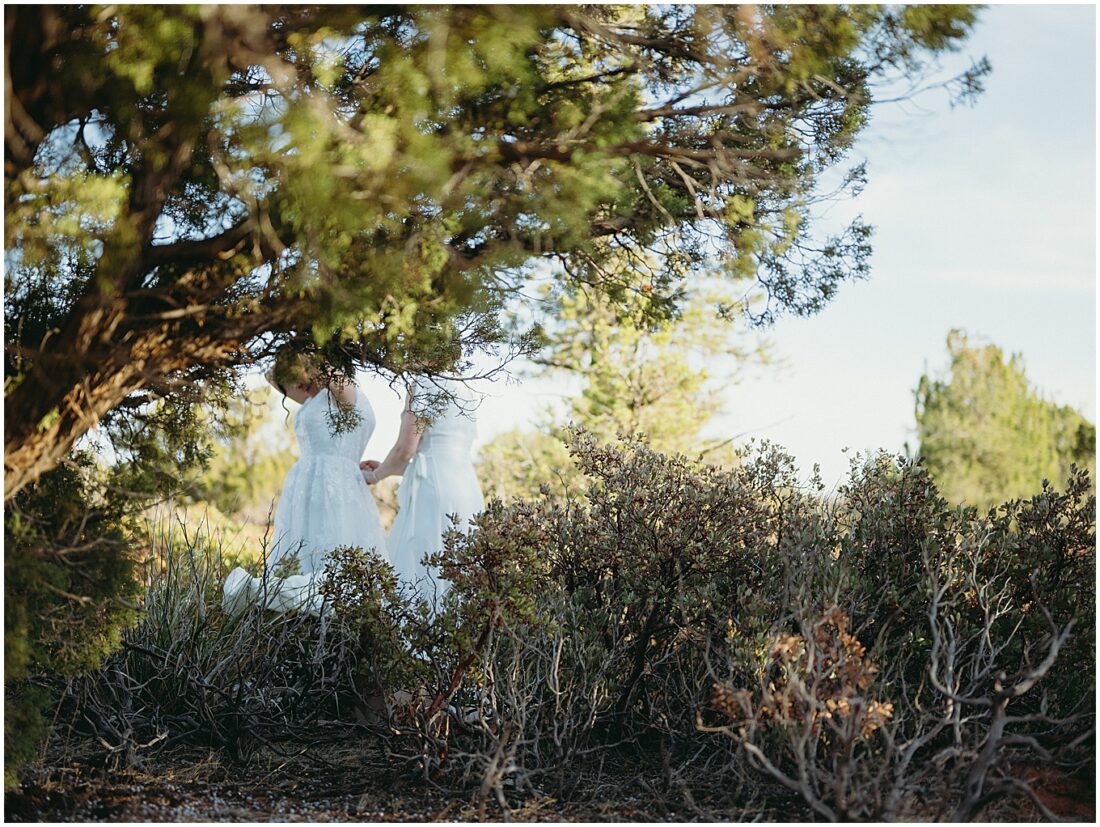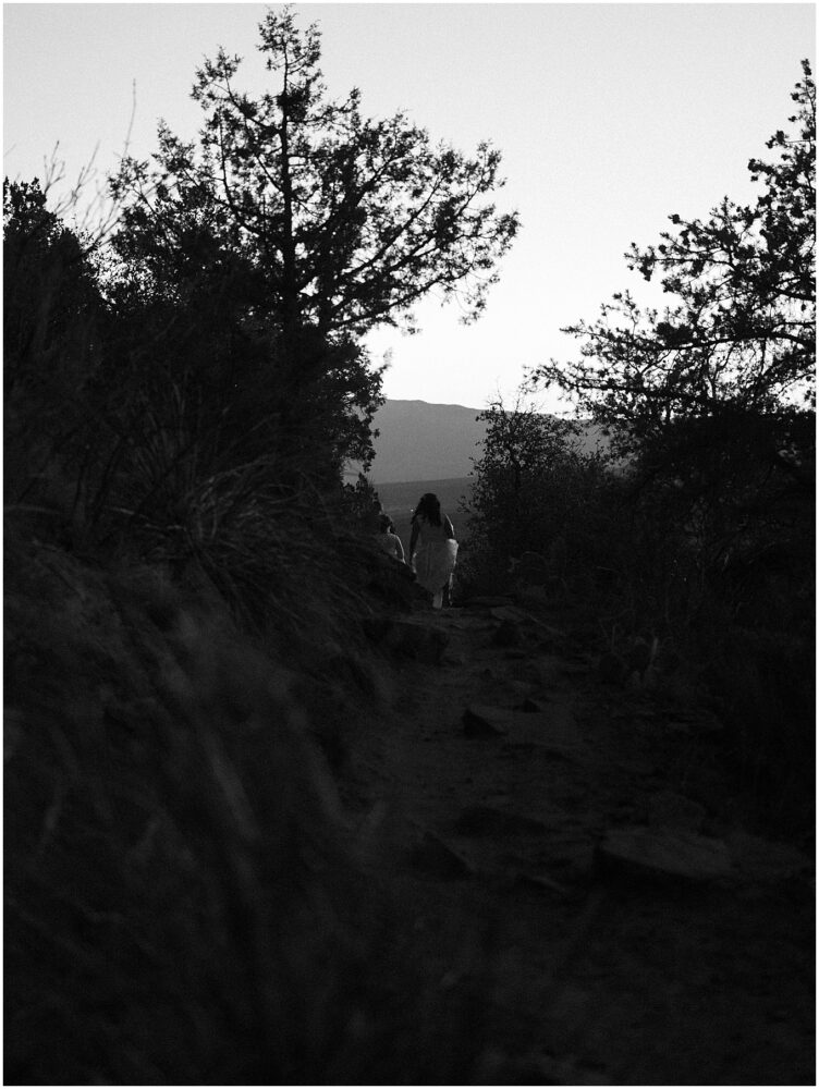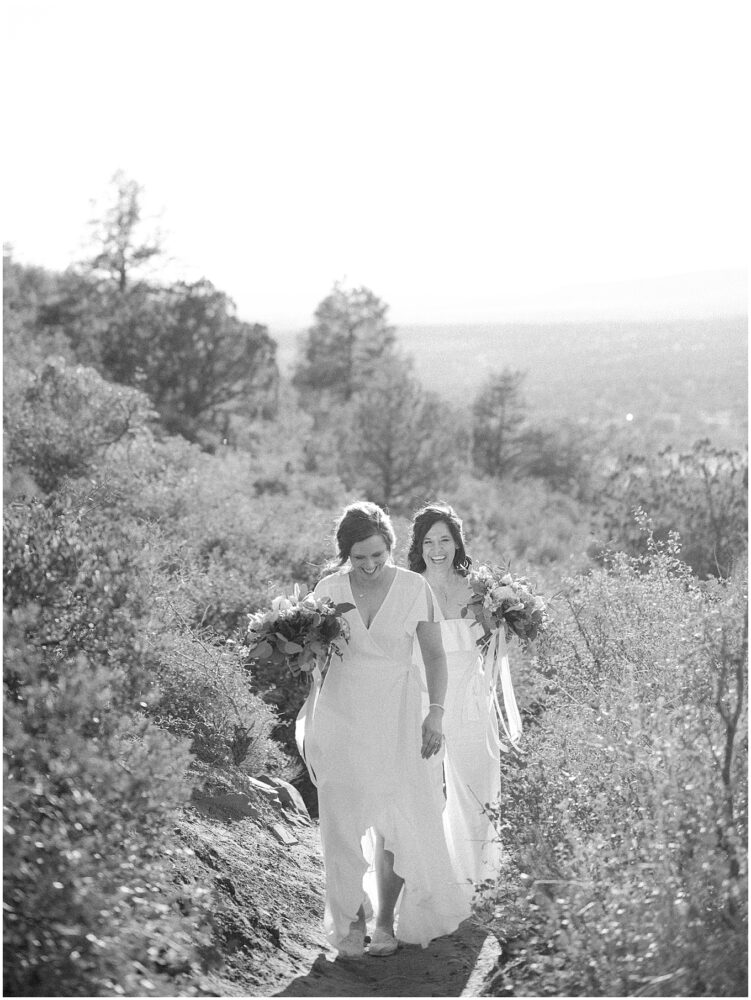 This hike is suitable for an elopement because it’s easy enough to do without breaking a sweat, but challenging enough to feel proud when you reach the top. What better way to begin the next chapter of life then with a sense of accomplishment! At the top, the two lovely brides swapped out their comfy bridal outfits for more formal wedding gowns. The desert shrubs made for the perfect make-shift dressing room. After a few laughs and some time to take in the views, they exchanged vows overlooking the valley. As the sun set below the horizon, we began the hike back down in the dark with only our cell phones to light the way.
