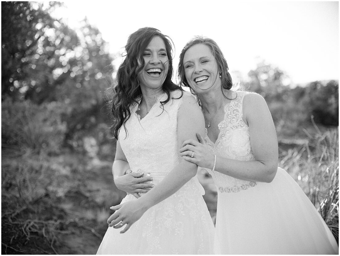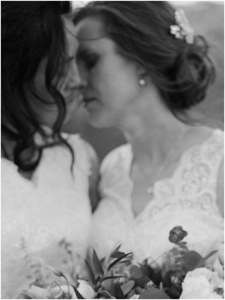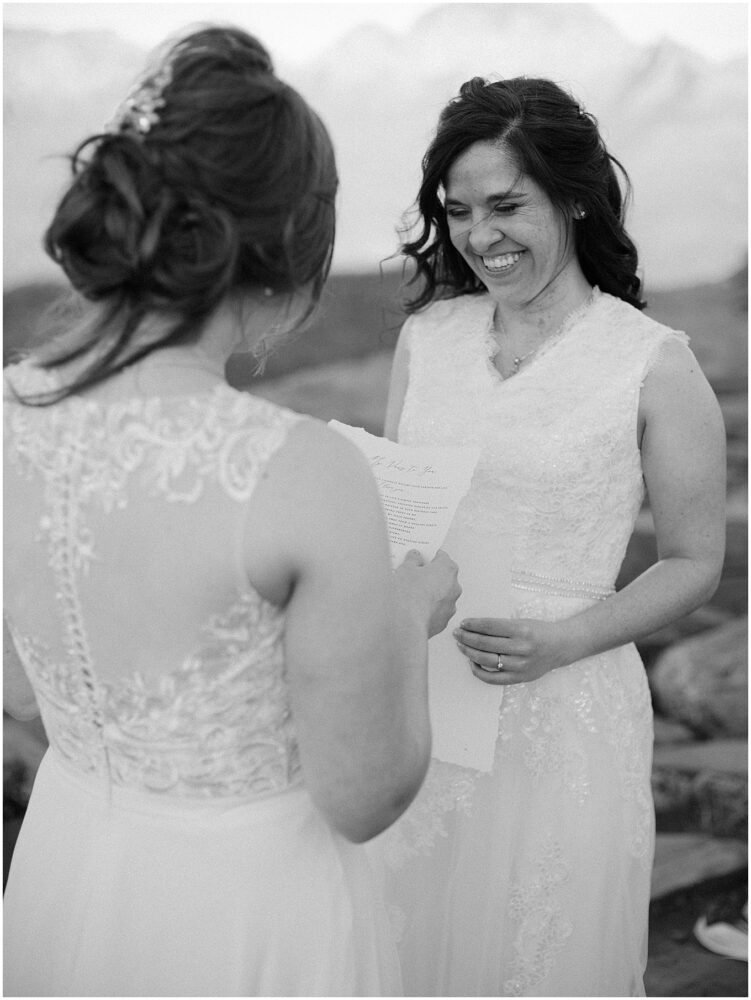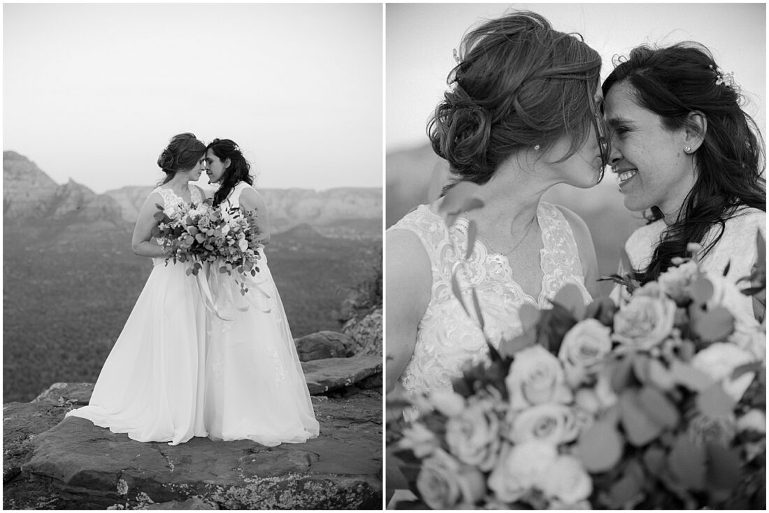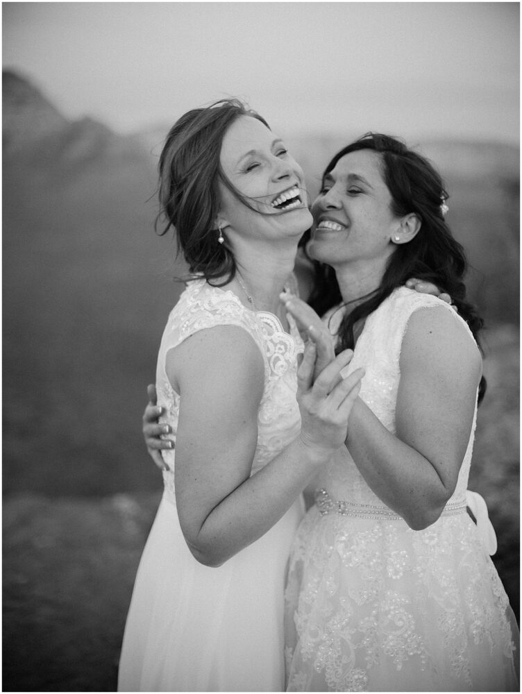 Wedding planning is very personal, and we needed to prepare ourselves for the vulnerability we would feel as we embarked on this journey. From getting the marriage license, to wedding dress shopping for two brides, to sharing an intimate moment on top of a mountain with onlookers passing by. This process challenged us, but it also opened our eyes. It opened our eyes to the good in this world and reminded us to assume the best in people. We were embraced, loved, and supported in every step along the way. Now wife and wife, we walk forward stronger, more confident, and so proud to represent the LGBTQ community.”