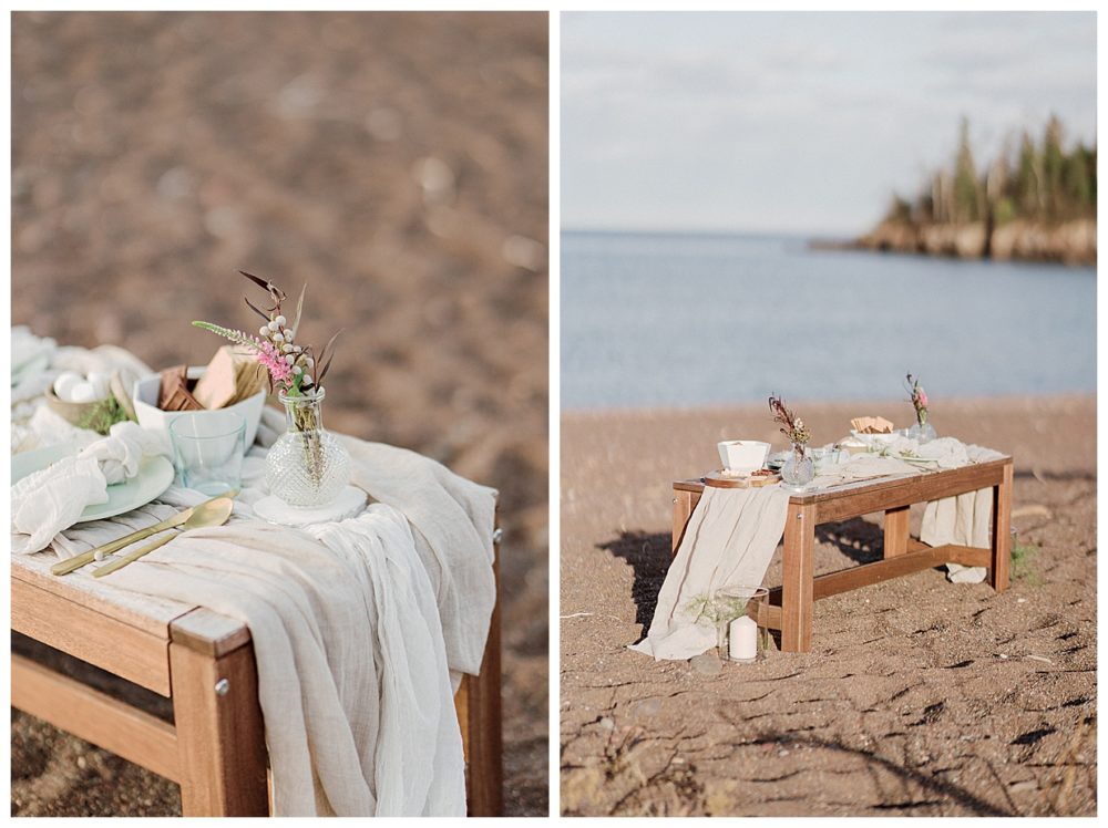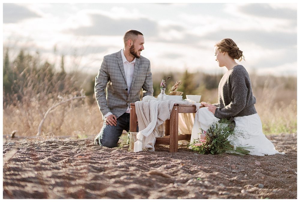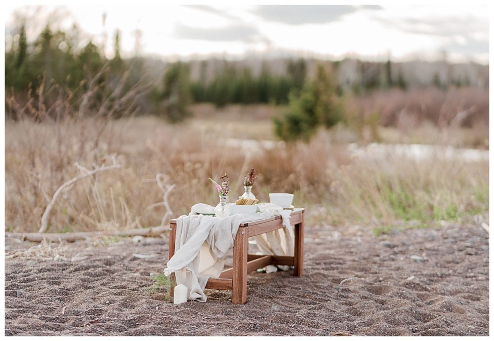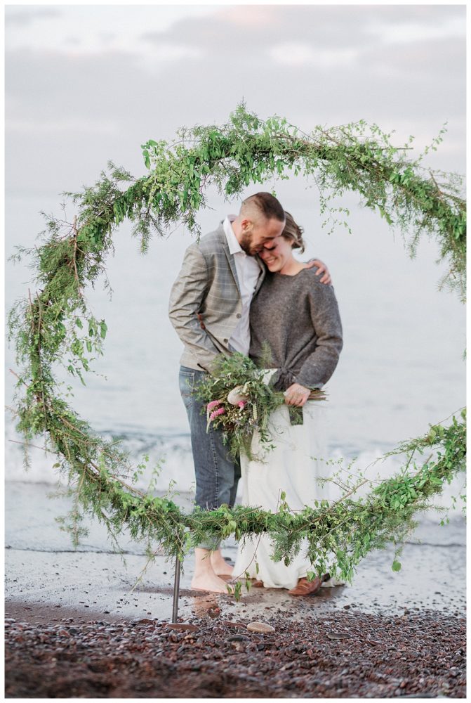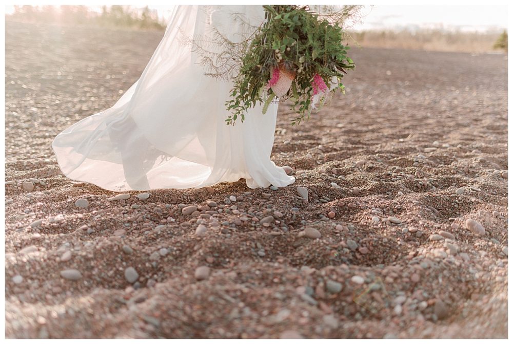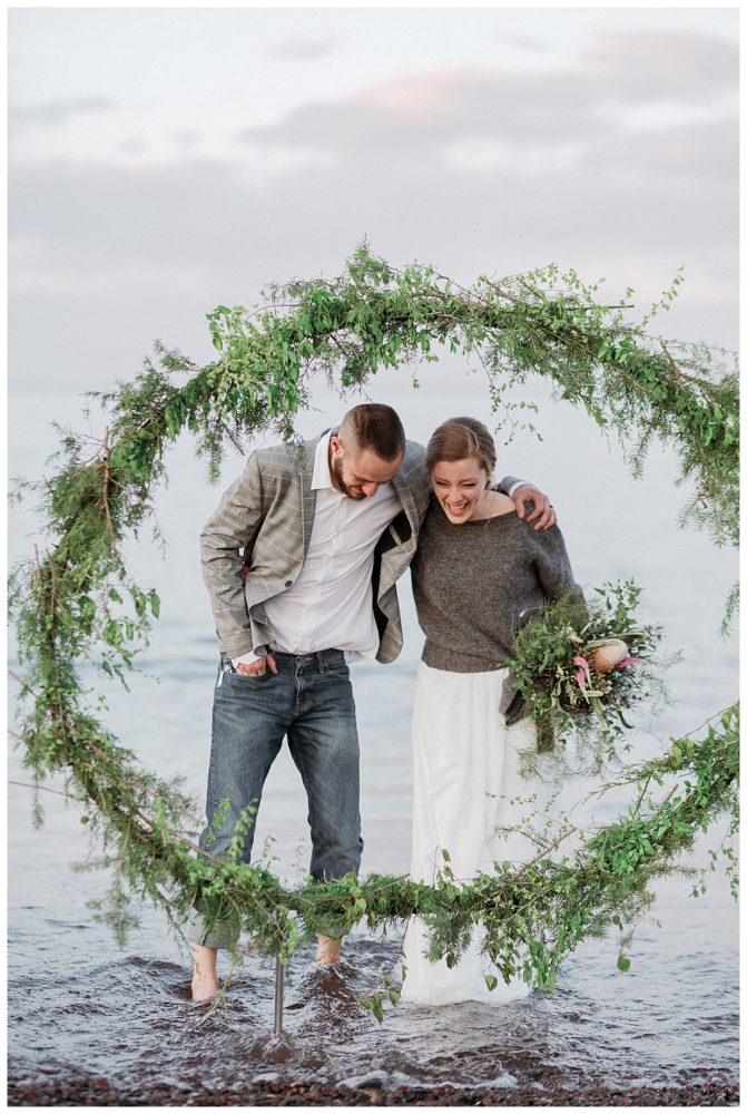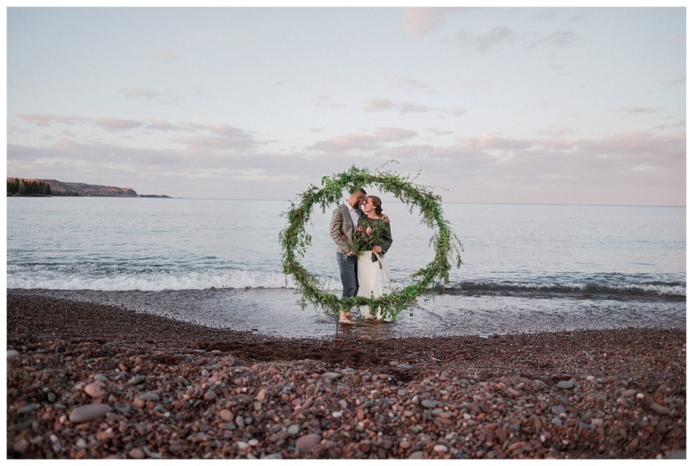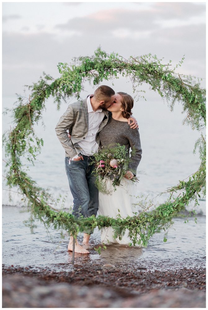 Samantha and Justin headed out to the beach just a couple hours before sunset. They enjoyed a nice walk with their high energy Bernese Mountain Dogs before enjoying a simple picnic overlooking Lake Superior. Thanks to Project Celebration, we had some fun in the water next to a beautiful floral arch. It was a great opportunity to find out who was tougher being the water was just a couple weeks thawed after a long winter. Samantha won that contest…Justin was in just long enough for some laughs, a kiss, and a “toughen up” comment from his bride. Okay…to be fair, Samantha kept her waterproof boots on and Justin was barefoot:)